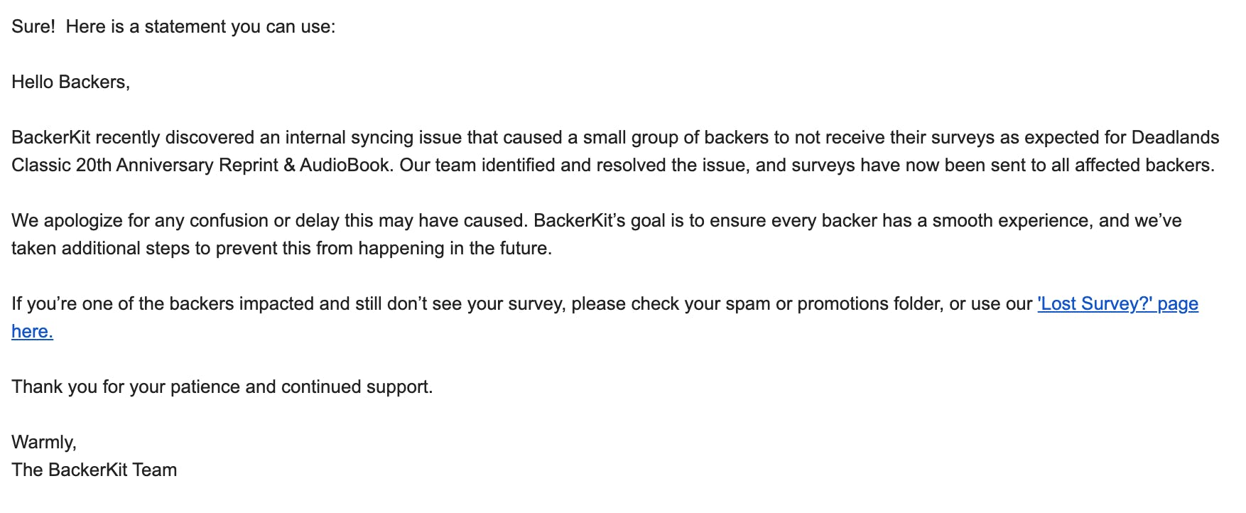What is happening: 1. EVERYONE should have received their surveys. If you’re one of the backers impacted and still don’t see your survey, please check your spam or promotions folder, or use this page: 'Lost Survey?'