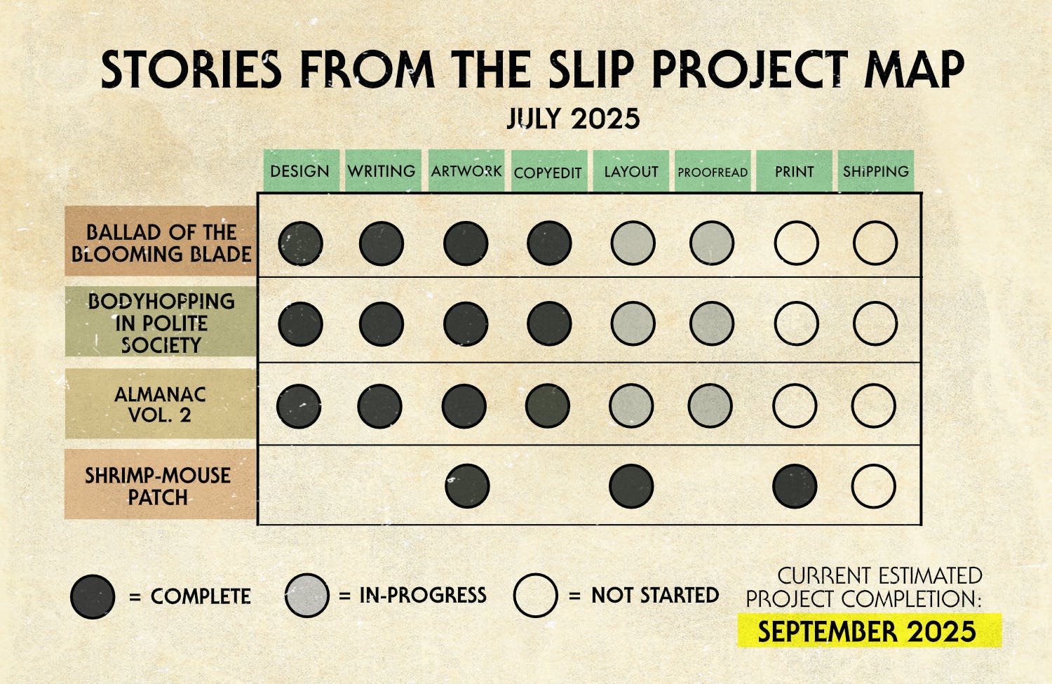 So let's look at the overall project map. I think we're in overall good shape. There could be unexpected delays in the printing process, but Print Papa (our US printer) has been very quick and responsive during the first Cloud Empress zine project.