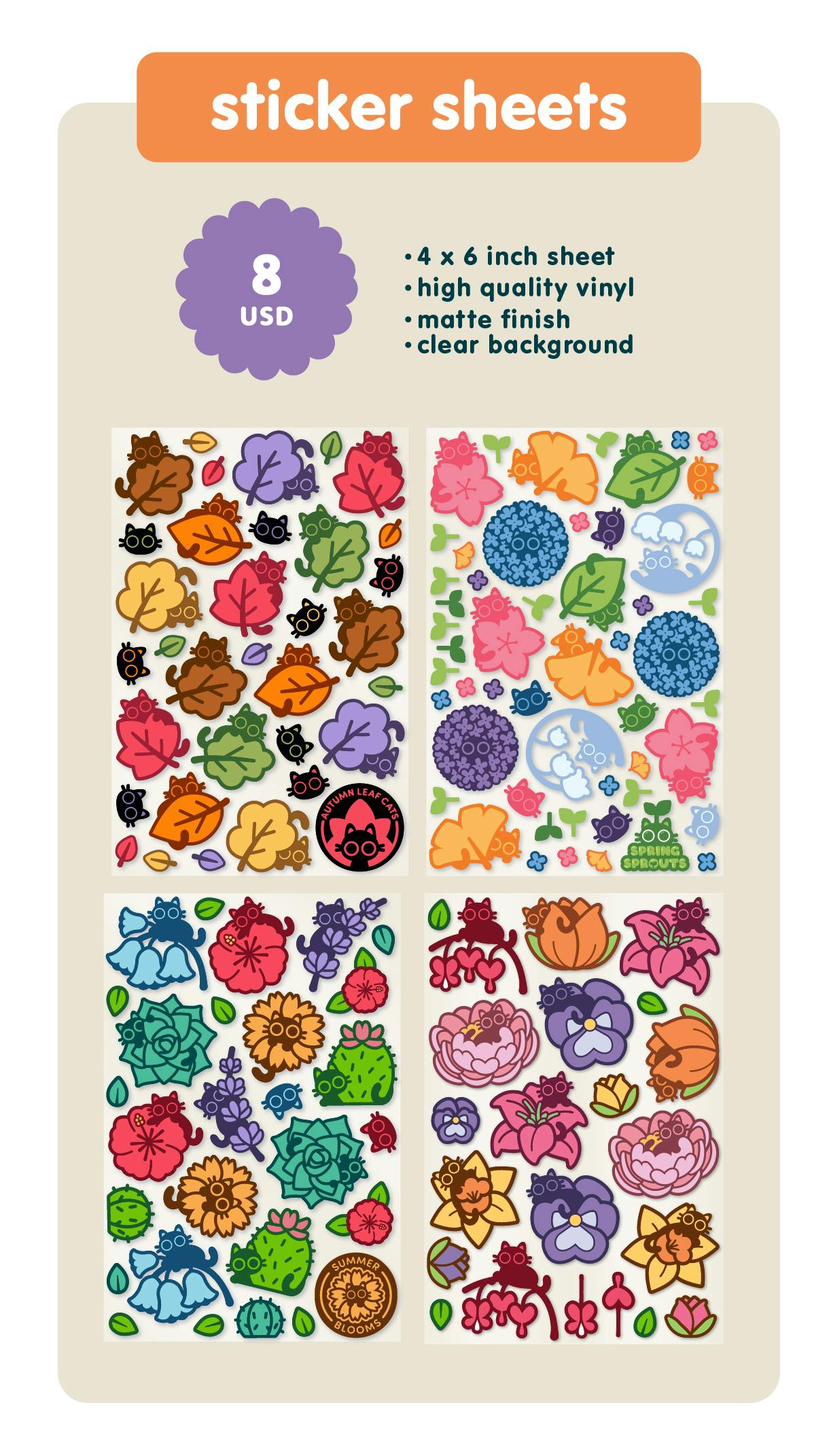 This collection is one I've been growing since 2023 with the Autumn Leaves set, and ever since then, I've fallen in love with drawing these tiny, cute little cats peeking out of the colorful flora.