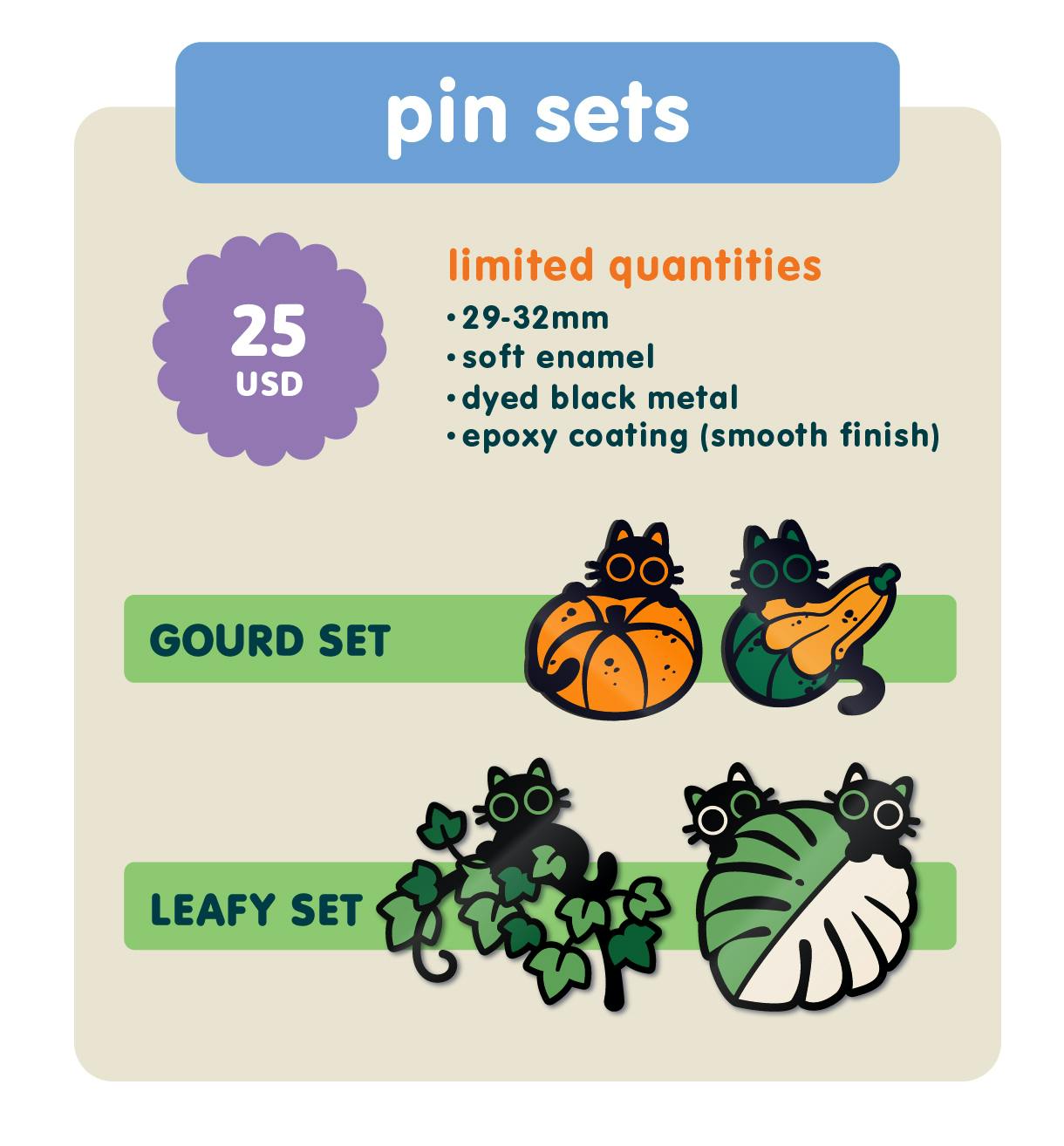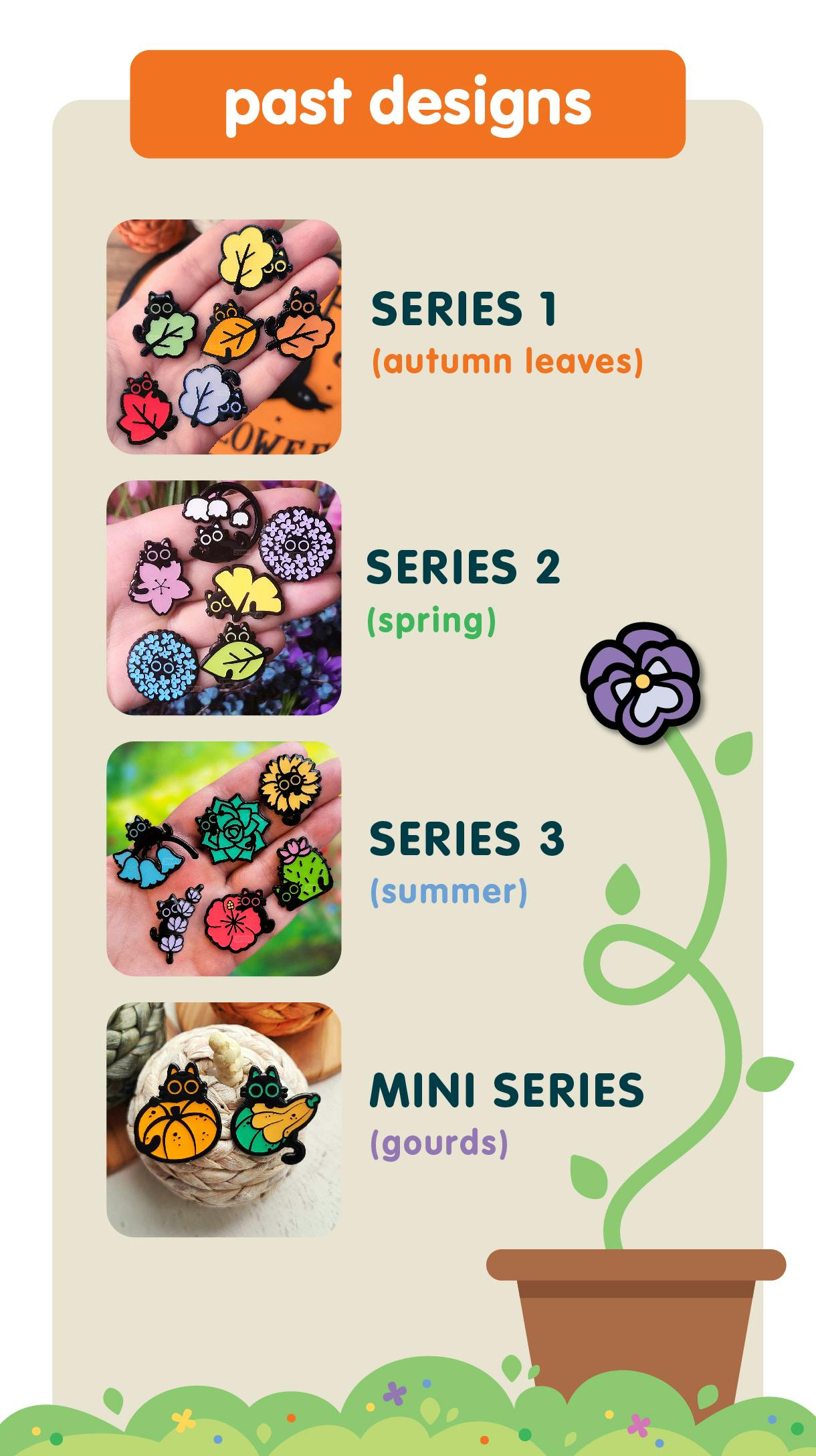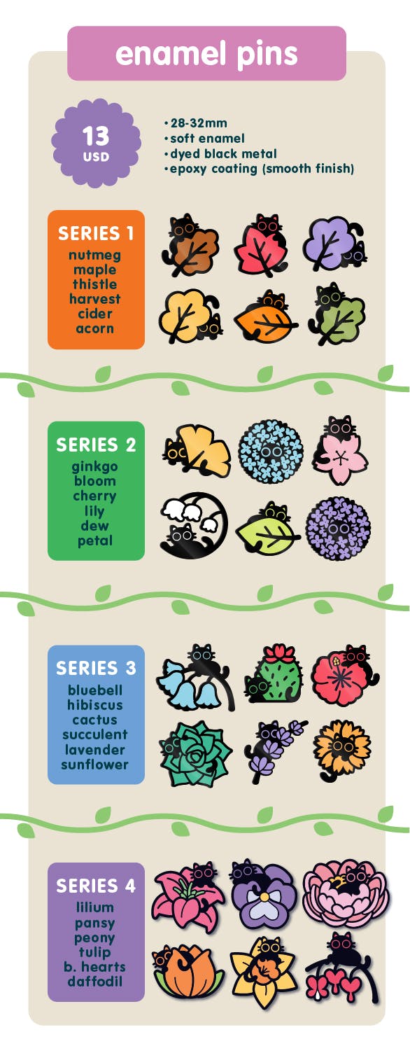 Welcome to the Black Cat Botanicals project: a series of black dyed enamel pins featuring stylized florals and tiny black cats hidden among the blooms. This project will feature Series 4 of my popular mystery bag black cats & plants pin collection, expanding on it with several brand new pin designs, stickers, sticker sheets, mini pins, and more!