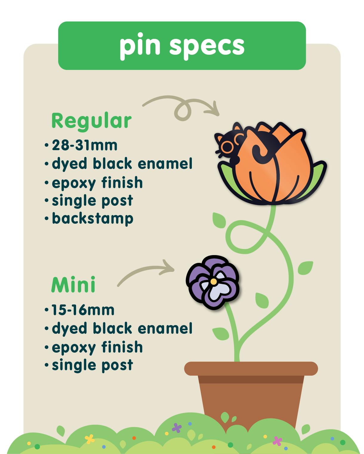 In order to keep the set as cohesive as possible, each pin design follows a similar setup of specifications below! The regular size pins are meant to be small in nature, with none exceeding 31mm (1.22 inches).
