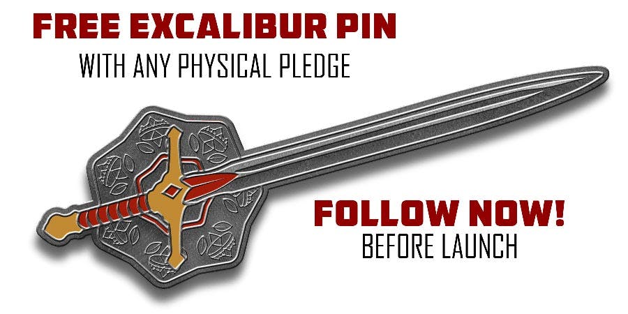 As a fan of ours, we want to make sure you don't miss out on a pre-campaign follower gift, a pin of the mighty Excalibur! Simply FOLLOW the campaign before launch by clicking the button below, and all physical pledges made during the campaign will be beknighted with Excalibur!