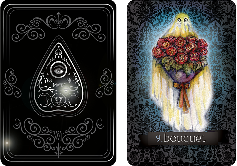 Card backs will be matte black with silver foil. Card fronts will feature Monica's watercolor paintings on an 18th century English damask.