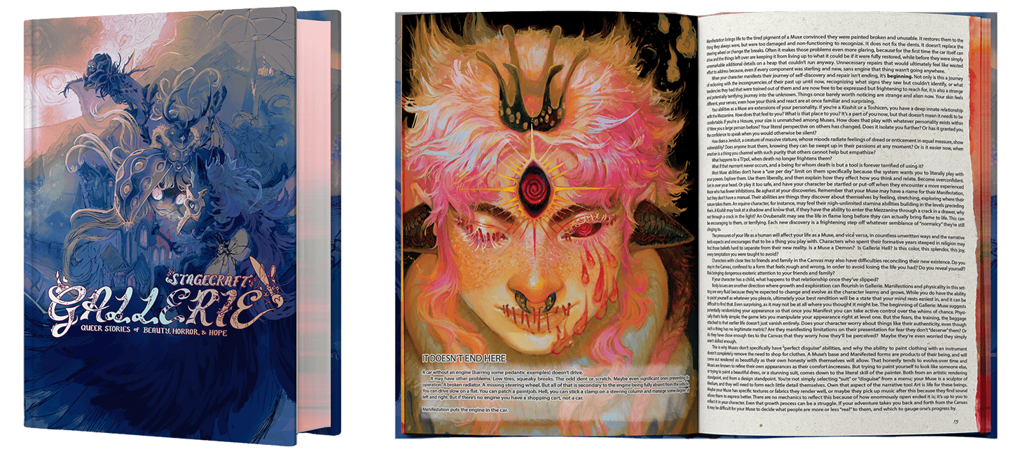 Gallerie is a queer-focused TTRPG about self-actualization that employs art and dream elements to paint narratives about redefining oneself and fighting one’s demons. It’s aboutcommunity, cooperation, unabashed self-love, facing hard memories, nightmarish enemies, systemic oppression, and the beauty of embracing what you know to be true but have been taught to ignore.