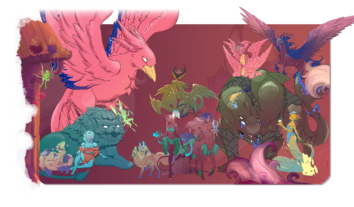 Within the Gallerie itself is a universe of amazing creatures and horrifying enemies. Enormous and powerful factions work to destroy or exploit the wild paint of Gallerie's tumultuous landscape. Notions and Nightmares, beings made of Medium, share space with humans that have themselves been radically altered by Patron Favors. Some find kinship with the Paint while others militantly combat it at every turn. Muses, too, are creatures of pigment. To some they are the bridge between worlds. Others see them as little more than demon parrots imitating humanity to bait humans to their ruin.