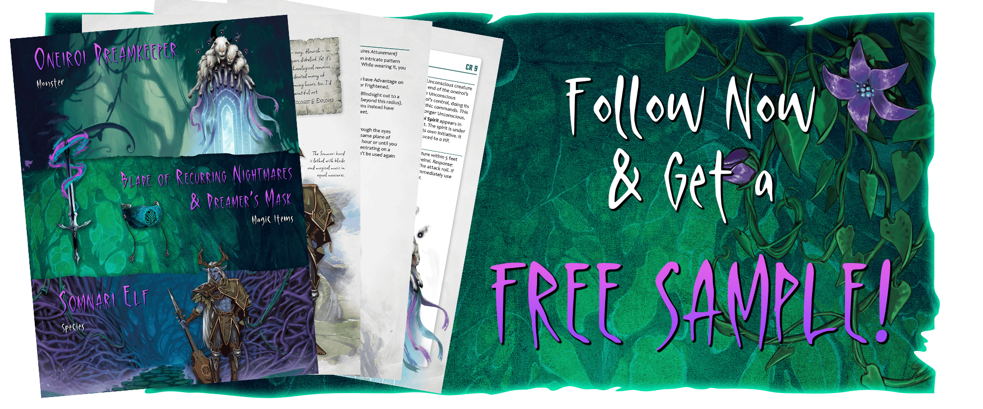 Want to become the master of your own dreams? Follow Now and get a free sample including the Somnari Elf, the Oneiroi Dreamkeeper, and two awesome magic items – Dreamer's Mask and Blade of Recurring Nightmares!