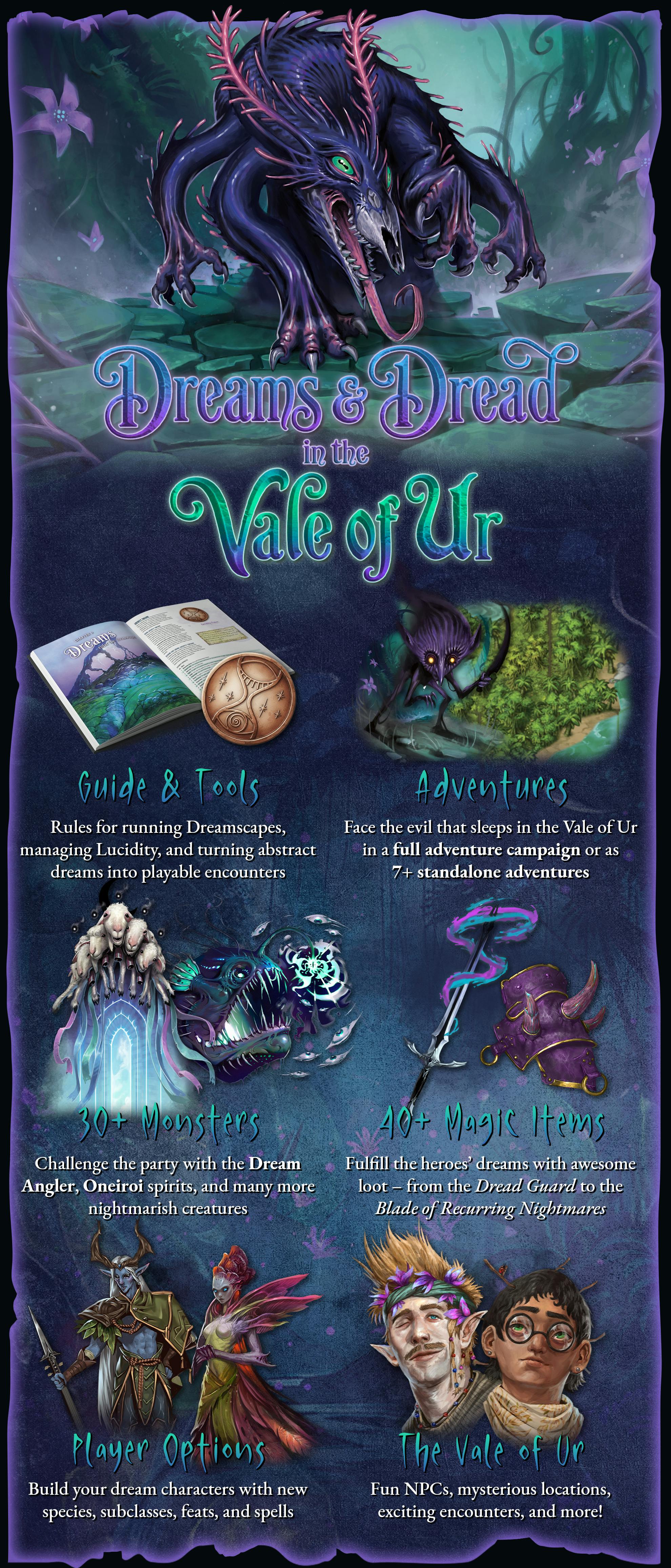 Dreams & Dread in the Vale of Ur is coming to Backerkit soon – a sourcebook and adventure campaign introducing a concrete ruleset for running dreams and nightmares, exciting new player options, nightmarish monsters, and dreamy treasures for 5E D&D!