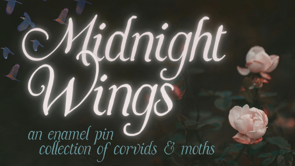 This will be a small collection featuring detailed enamel pins with special effects. There will be crows & Ravens with midnight wings, and detailed moths flying in the midnight skies. This will be a beautiful and ethereal collection.