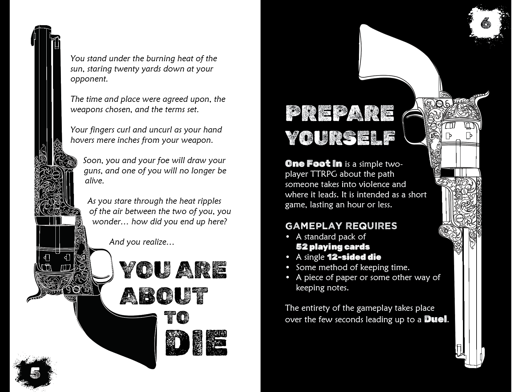 One Foot In is a two-player narrative TTRPG about someone who's chosen a violent path facing the memories of their past...