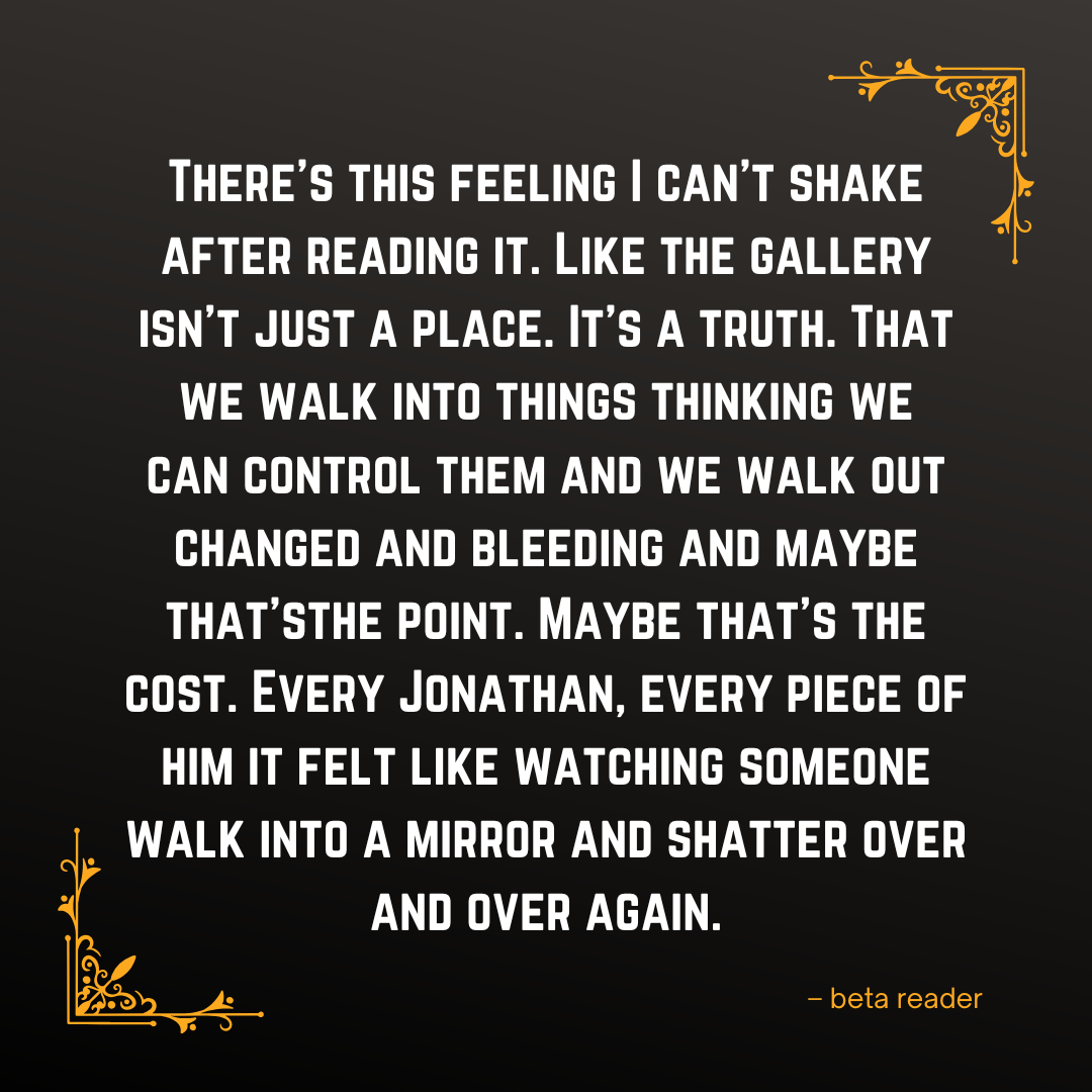 For Jonathan, change is never easy. Especially when you've built a suit of armor around yourself that protects you from your family and friends. One day, Life had handed Jonathan a gift he could never repay—the Gallery of Nightmares. With the dark paintings that helped people who experienced trauma and his buddy Lars to help manage the gallery, he thought life was just perfect.