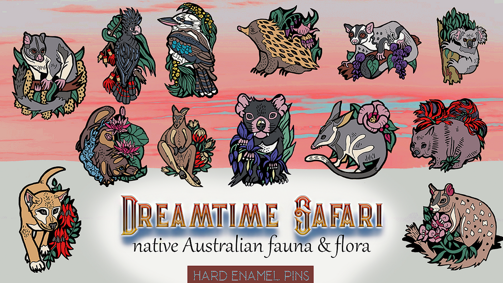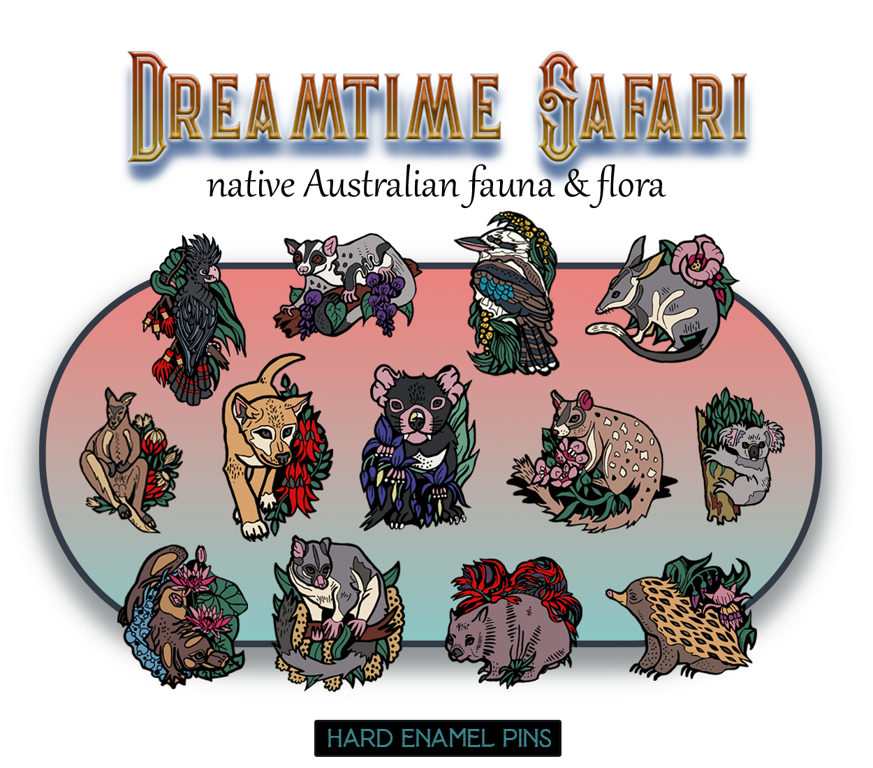 Join me on a journey inspired by my recent exploration of Australia's breathtaking landscapes! Enchanted by its unparalleled biodiversity, I've created the Dreamtime Safari collection—a homage to the captivating native fauna and flora, captured in 13 exquisite hard enamel pins.