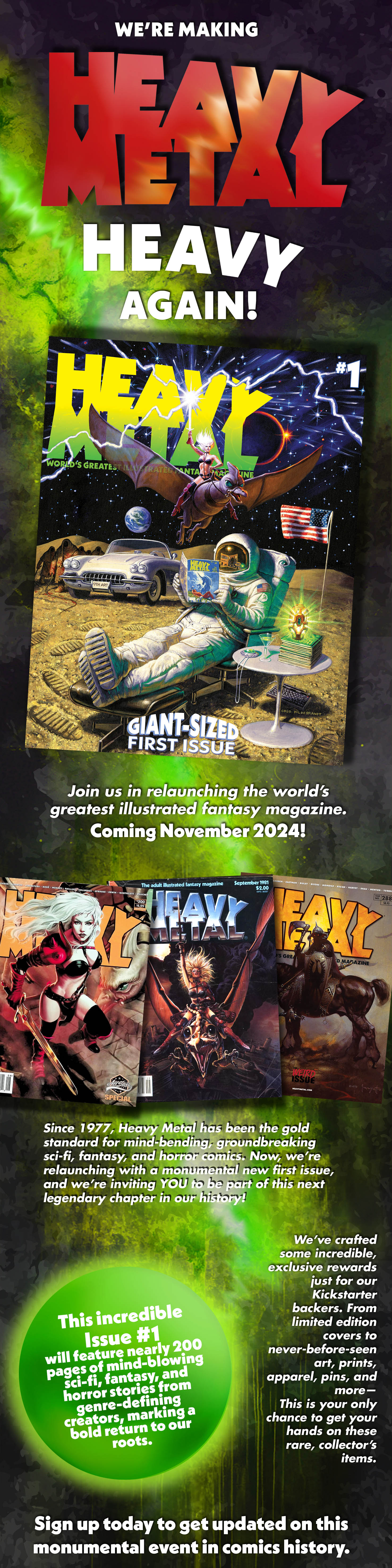 Be part of this amazing opportunity to be a part of the relaunch of Heavy Metal, the World's Greatest Illustrated Fantasy Magazine. Whether you're a veteran fan or a new explorer, we welcome you. Dive into the weird, forbidden worlds of past, present, and future -- and discover sci-fi, fantasy, and horror like you've never seen before.