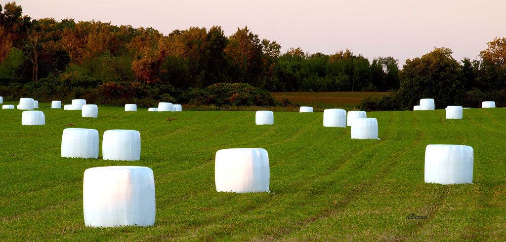 Marshmallow Fields is an art installation of thirty marshmallow bales in a farming field