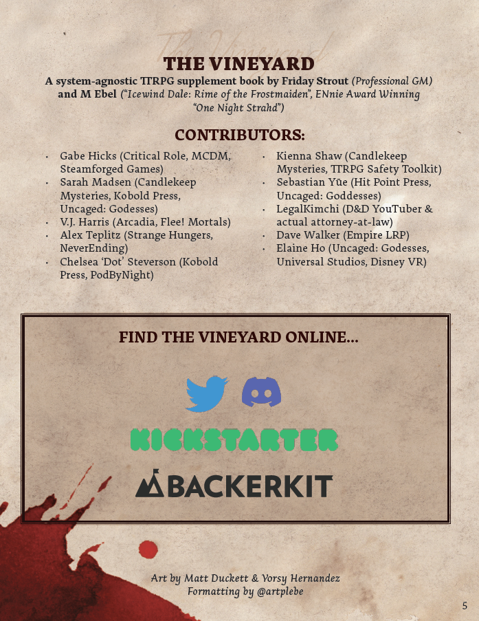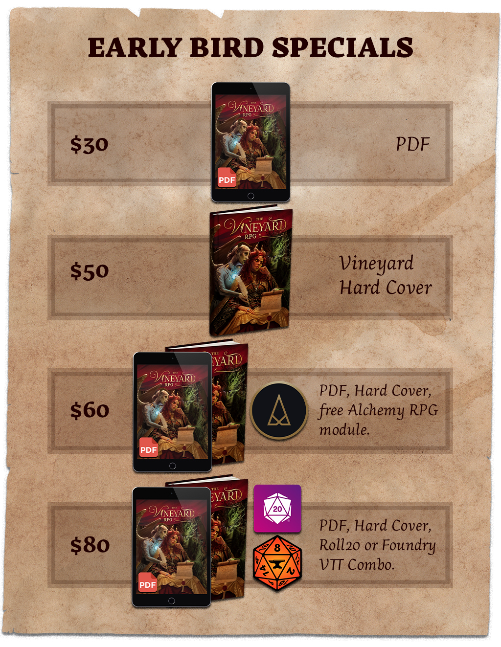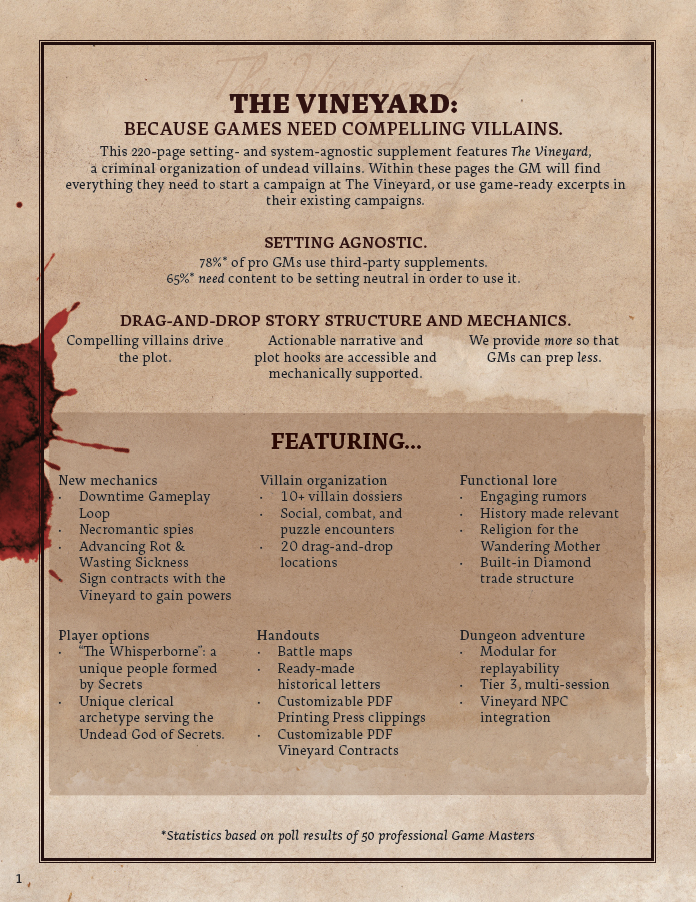 The Vineyard RPG is a setting & adventure book utilizing the Kobold Press Project Black Flag system, featuring a criminal organization of undead villains.