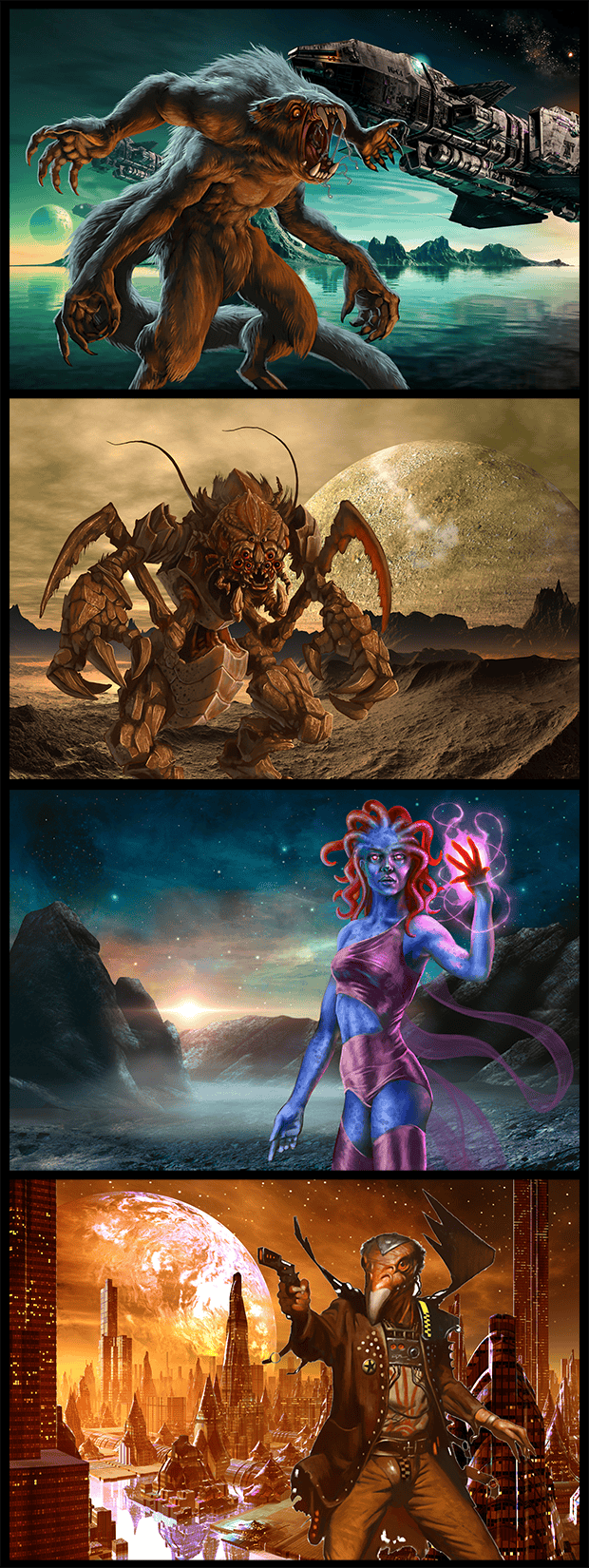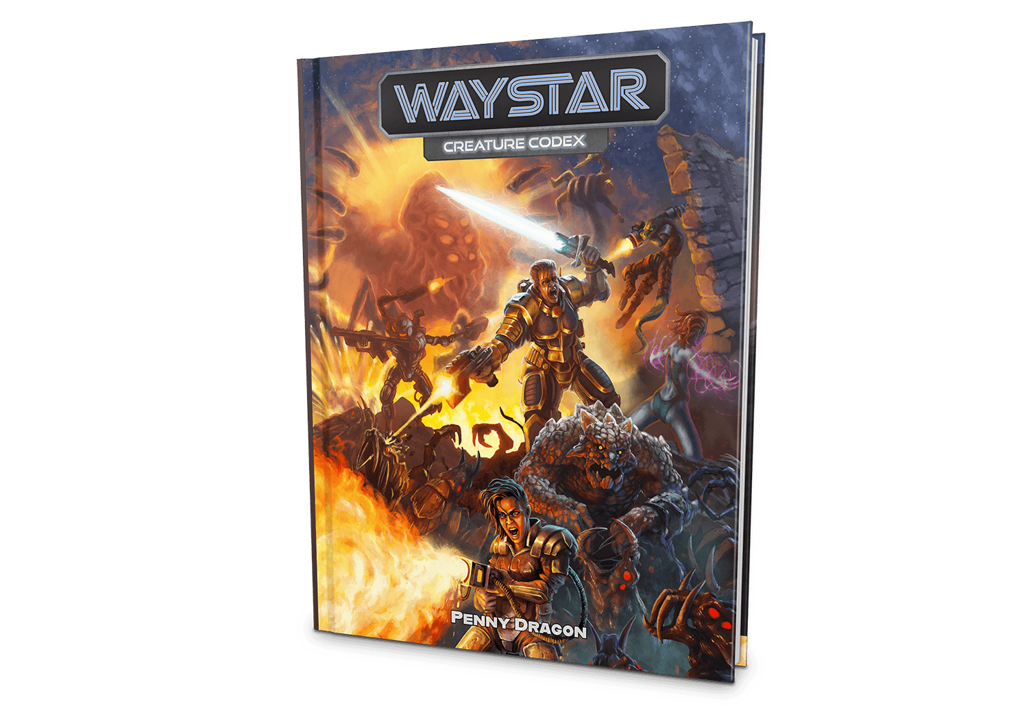 The WayStar Creature Codex book includes 100+ monsters (and many more as stretch goals) for GMs to create rich and challenging encounters. Each creature comes with its own stat block, lore block, and original illustration. The book will also include details on monster behaviors, environments, and tactics.