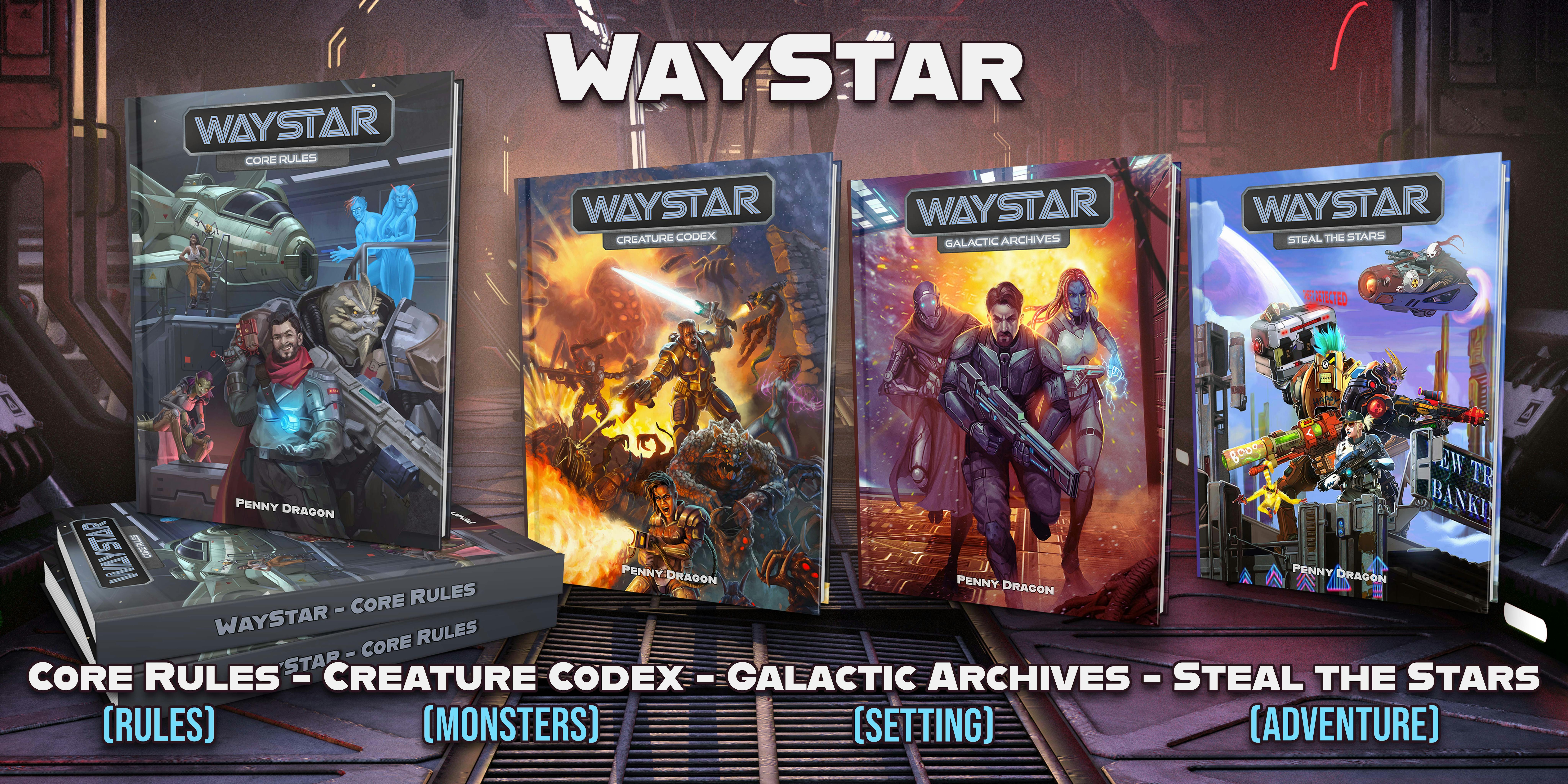 The WayStar Core Rulebook covers everything players and GMs need to play and run the game, including flexible character creation tools with new classes and species, and rules for combat, ship creation, space combat, space travel, gear, cybernetics, robotics…and so much more than we can possibly list here.
