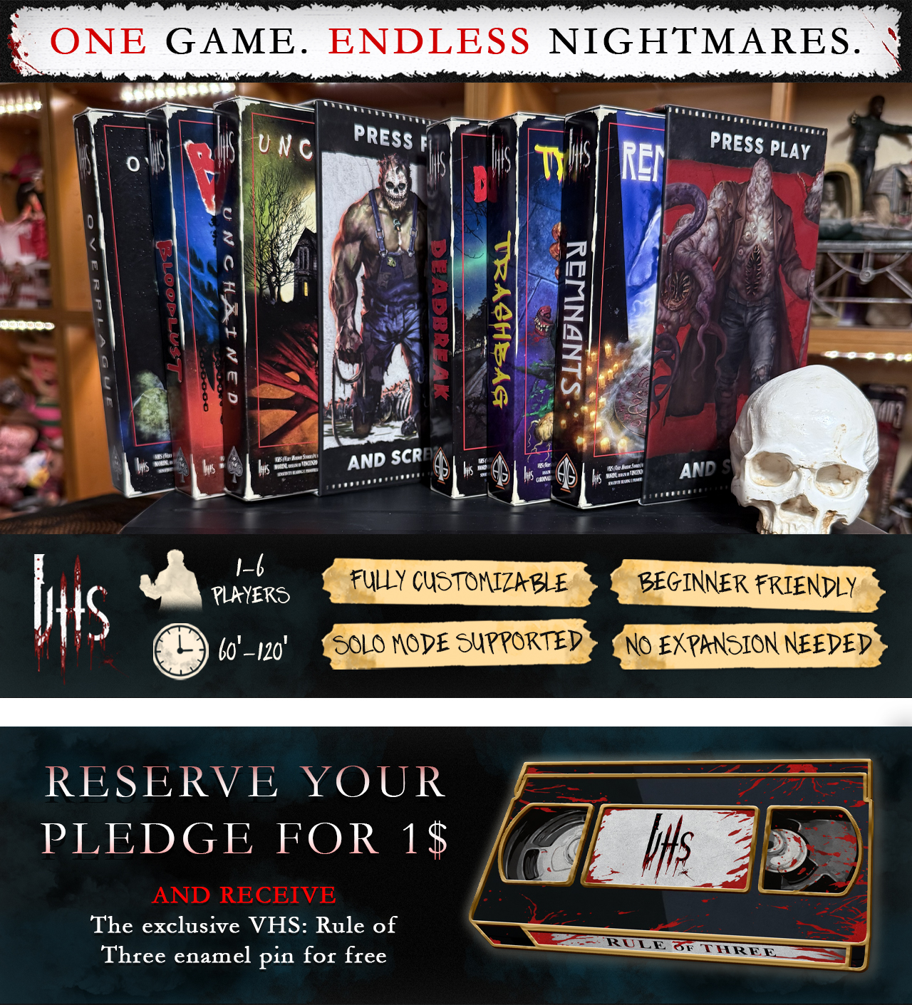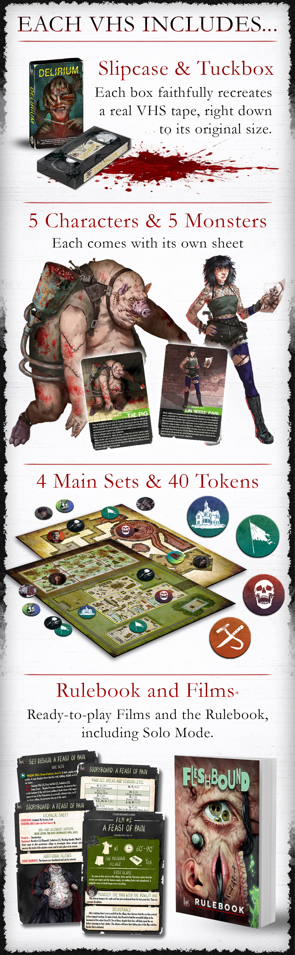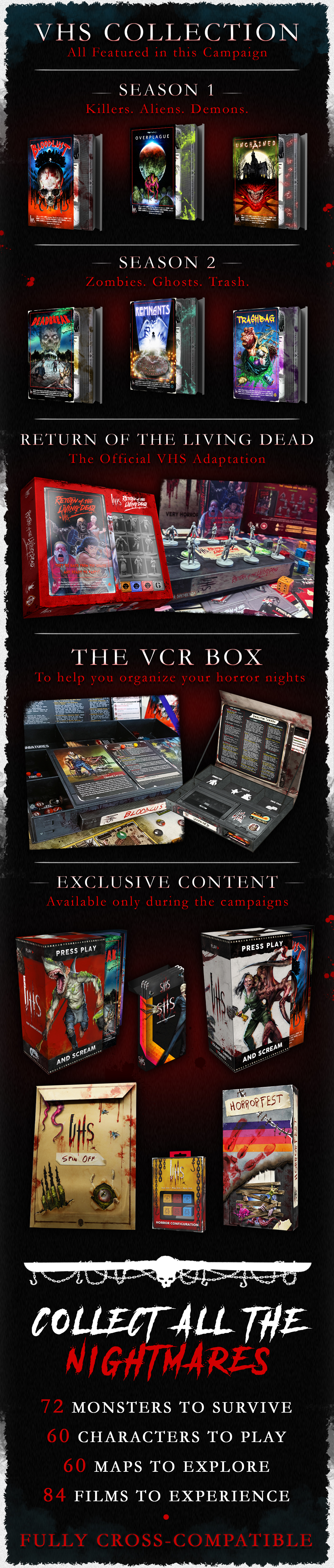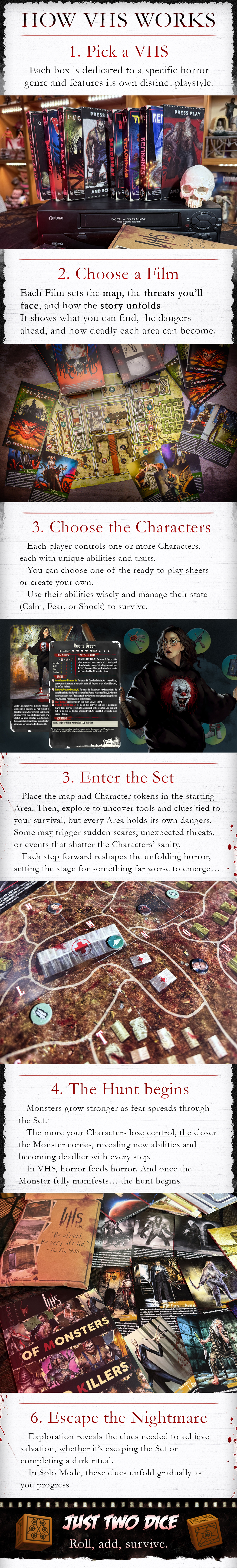 Each VHS box is fully standalone and includes everything you need to play: rules, characters, monsters, maps, pre-built scenarios, and digital content.