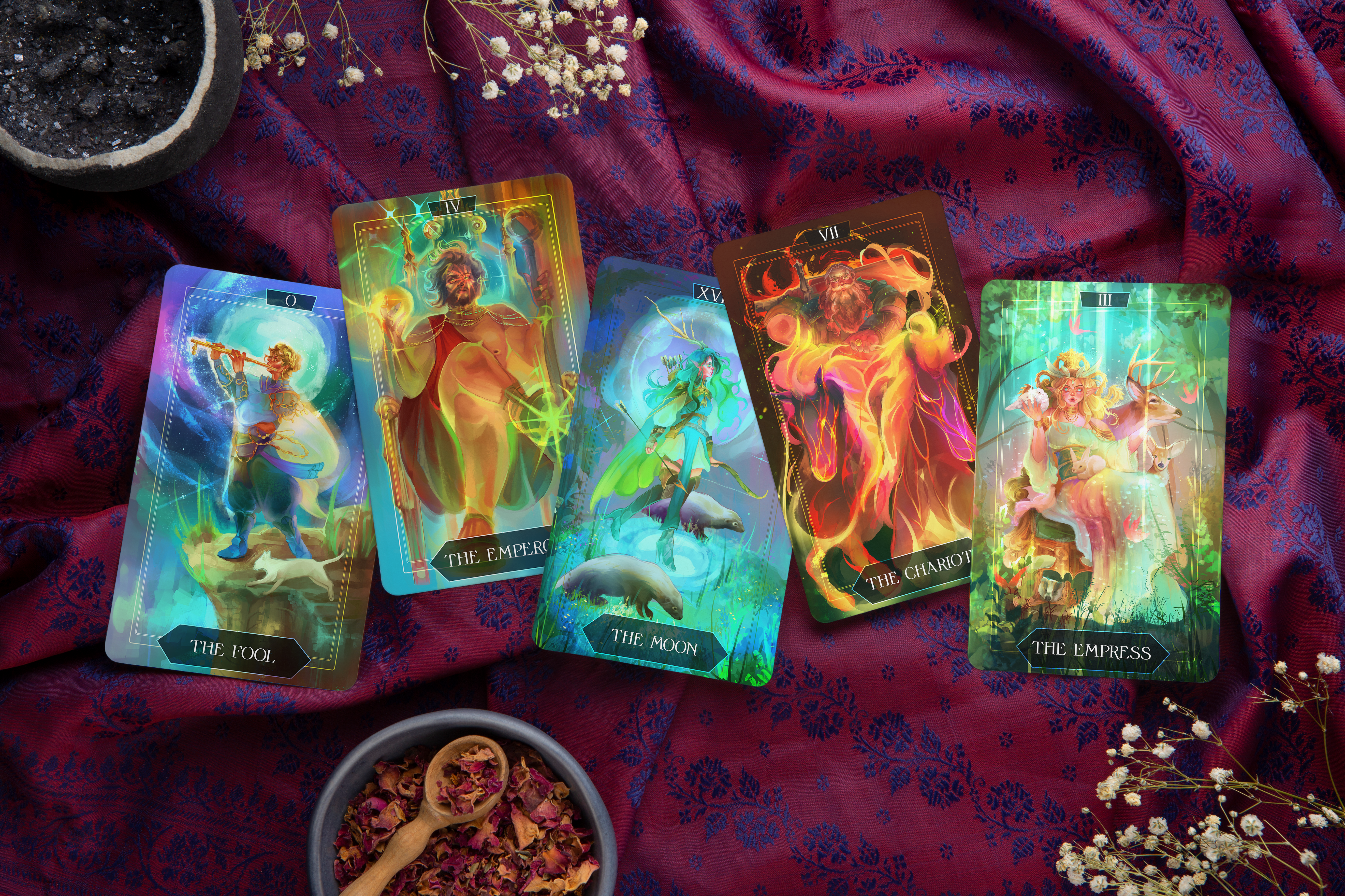 Alongside the core rulebook, you can grab the exclusive 78 Card Tarot Deck Designed for the game! This deck will be 78 pieces of unique art printed on heavy stock tarot cards to give a smooth experience both in and out of game.