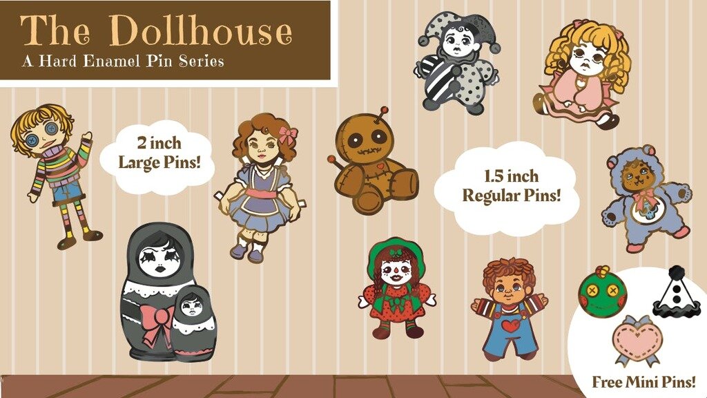 This enamel pin series features large, small, and mini pins featuring different types of dolls! Some are golden, rose gold, or even black nickel plated! Take your pick of a doll that resonates with you, or even one of the trios of friends!