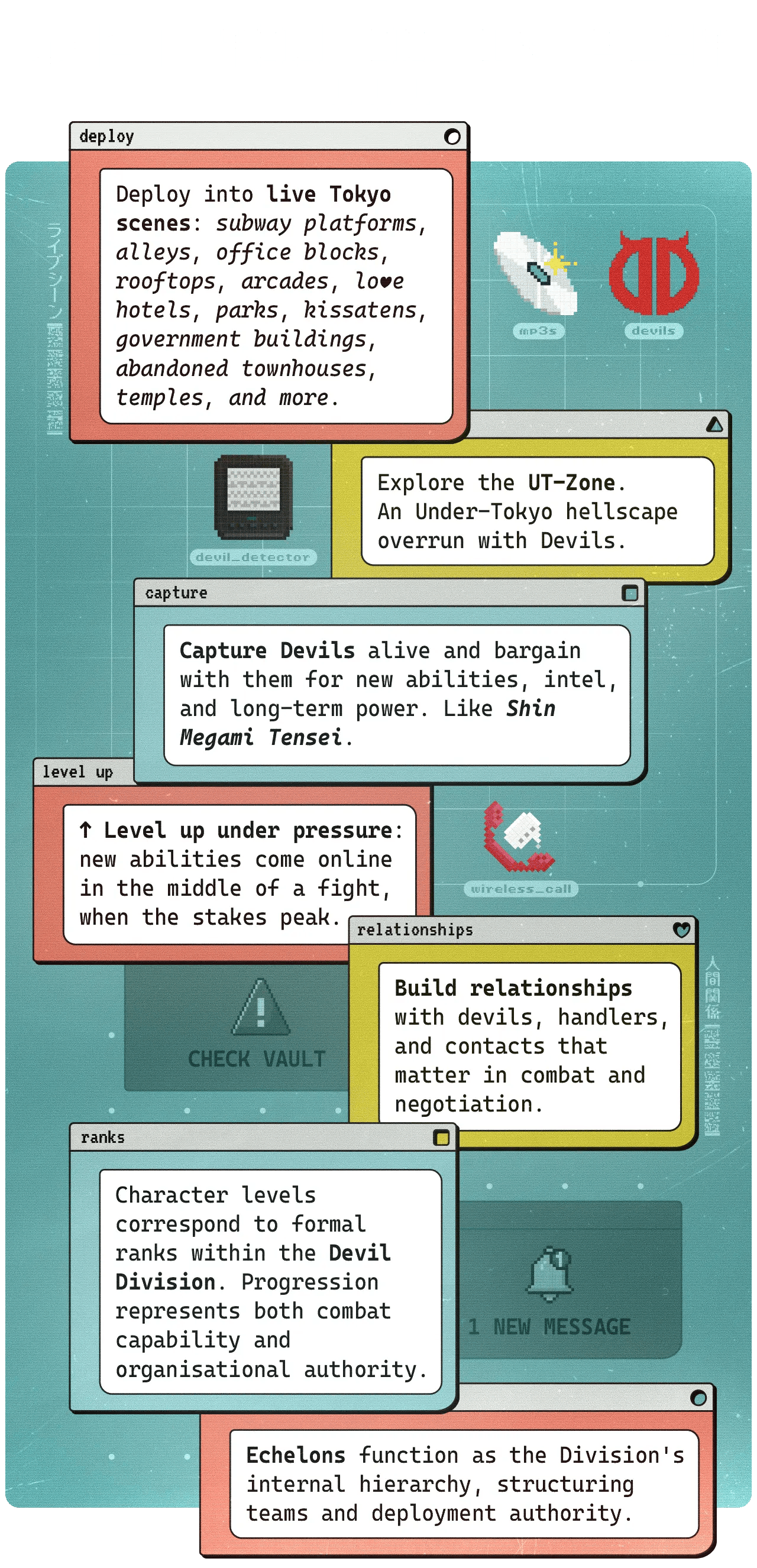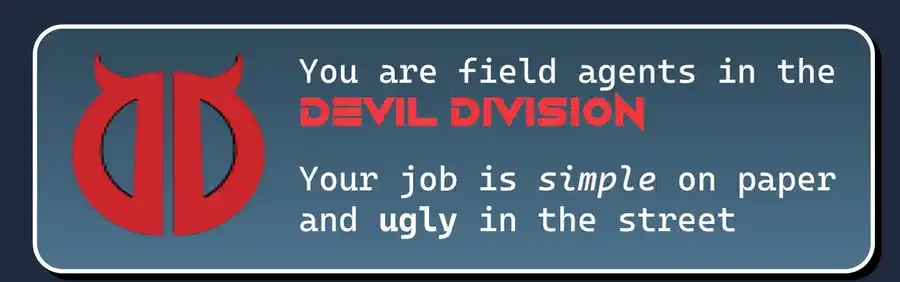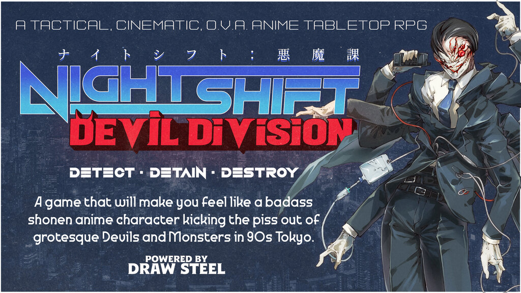 Night Shift: Devil Division is a standalone* TTRPG that uses the Draw Steelengine to deliver fast, punchy, grid-based combat built around combos, teamwork, positioning, and big signature techniques. Triumphs build momentum across operations, so pushing deeper makes you stronger and risks more, exactly like the best shonen arcs: the longer the night runs, the more dangerous everyone becomes. Adrenaline (Agent Resource)fuel clutch saves, last-second tactics, and cinematic reversals when the squad is on the brink.