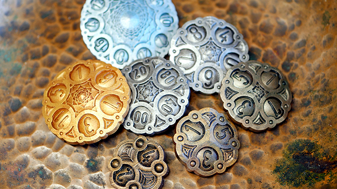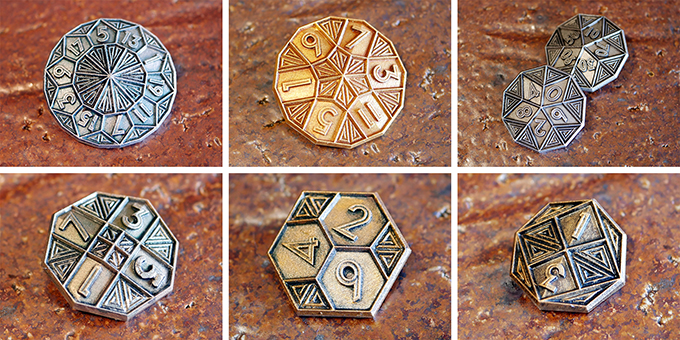 The dice set will replicate the variety of metals used in the currency of fantasy role playing games: copper, electrum, steel, silver, gold, and platinum. The designs are meant to evoke the aesthetic of a fantasy forest kingdom. Each coin will be cast in zinc alloy with a two-part mold, plated with an appropriate color, and aged with an antique finish. The basic physical pledge level ($40) includes the seven metal Forest Kingdom Coin dice and free shipping in the United States.
