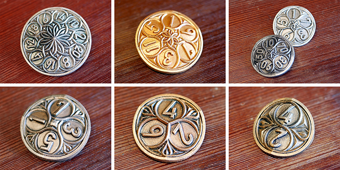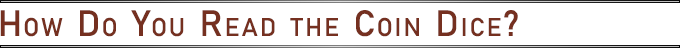 The coin dice may appear difficult to read. This is because of the flattening effect of photography. The result of a dice roll is the highest number on the die, and this is readily apparent in real life because of the 30° dihedral angle between planes on the dice.