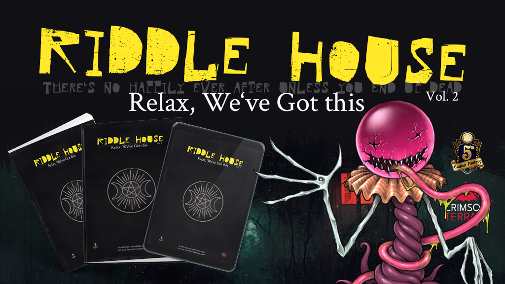 Welcome to Riddlehouse Vol. 2, the second installment in our horror-themed third-party adventure series for the world's most popular roleplaying game! Packed with over 30 new monsters, new spells, artifacts, curses, traps, puzzles, and an expanded group patron, Riddlehouse Vol. 2 is your one-stop shop for all your horror needs.