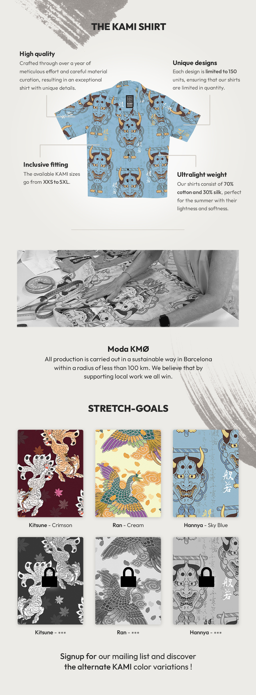 KAMI is a sustainable clothing brand from Barcelona, Spain. In this first release we present a collection of Hawaiian shirts with designs not only inspired by traditional Japanese folklore, but also designed by our own Japanese artist, Sen Kawamura.