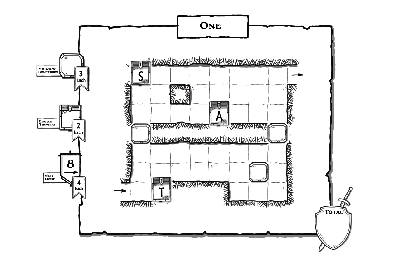 Each turn, place a word horizontally or vertically on the map. Your first word must pass through the starting square (next to the in arrow). Each subsequent word must connect to an existing word by sharing or touching a letter horizontally or vertically, not diagonally. Words may read from top to bottom or from left to right. All letters placed on each turn must be in one row or column.