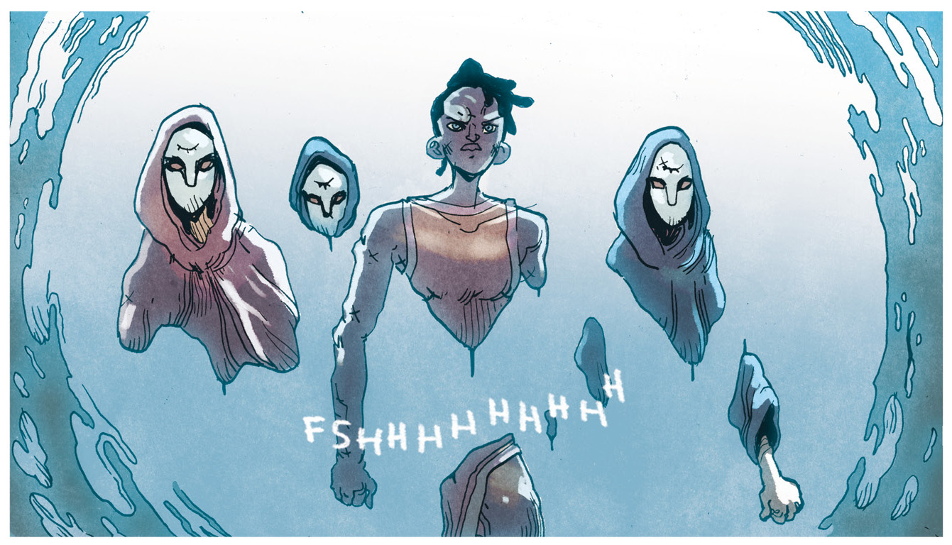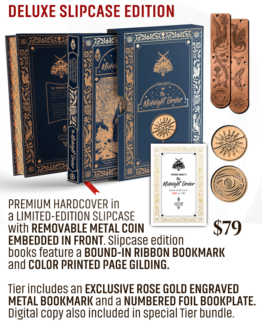 This Kickstarter will offer this 272-page graphic novel in either softcover or premium hardcover or the ultimate version: a very limited-edition slipcase with an embedded metal coin, printed gilding on the page edges, and foil-stamped and numbered bookplate. This edition also includes an exclusive ETCHED METAL BOOKMARK.