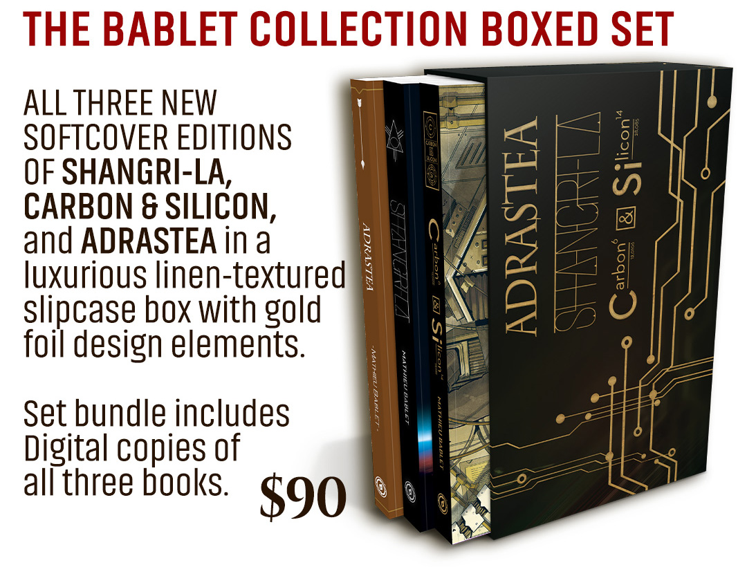 Also premiering in this campaign are brand new softcover editions of Mathieu's award-winning, sold-out books SHANGRI-LA, CARBON & SILICON, and ADRASTEA!
