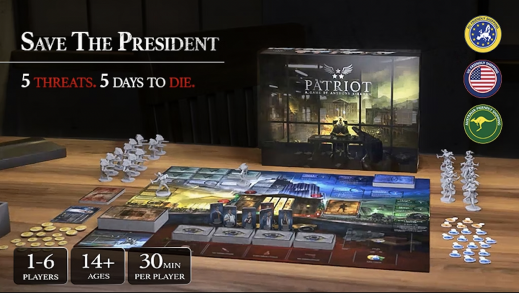 Patriot has been professionally play tested, contains a 1-2p campaign mode, and a 3-6p espionage and social deception game mode, all of which are easy to pick up but hard to master. Patriot will play differently every single time through the countless options provided by the board and cards.