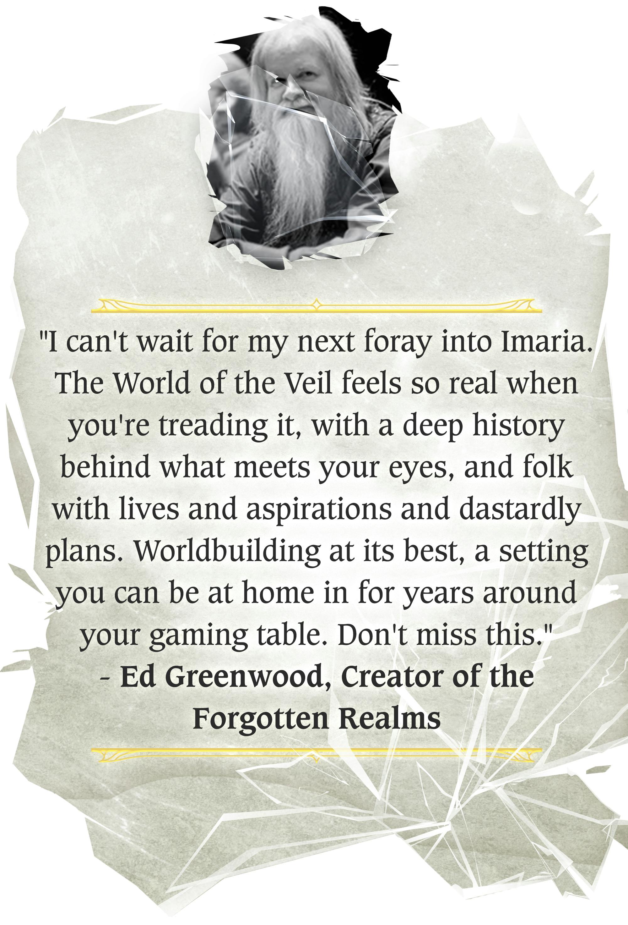 Imaria: Beyond the Veil is a massive 5E campaign setting and adventure series crafted by veteran designers and renowned industry luminaries. These tomes bring over 600 pages of new, innovative mechanics and lore to 5E, based around four Pillars of Power: mana, anti-magic, psionics, and ethereal chronomancy. Together, these powers shape a vibrant and extensive world cut off from extraplanar forces by a net of temporal energy known as the Veil.