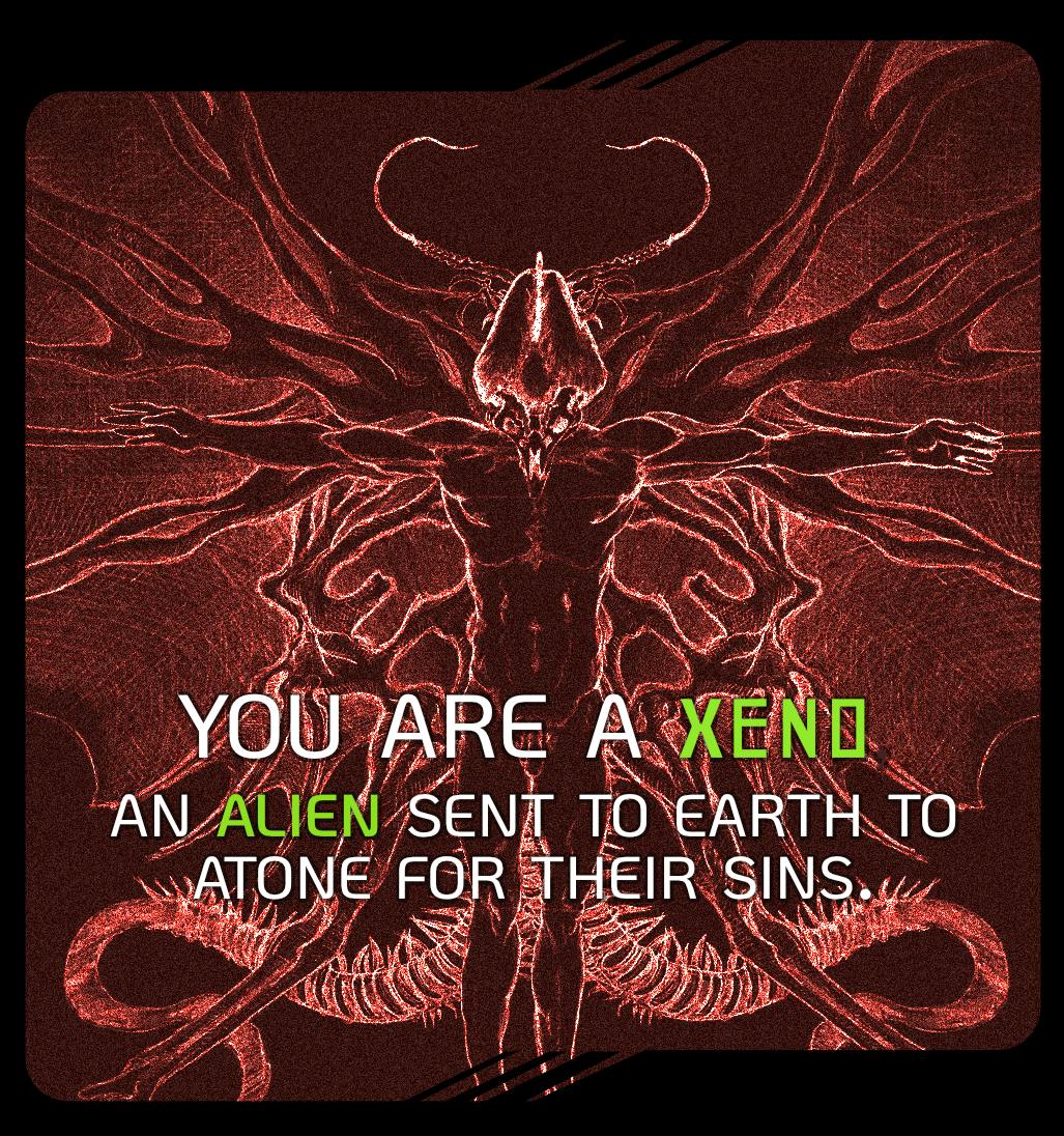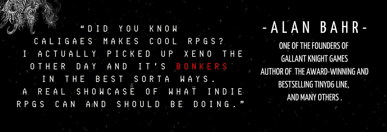 Caligaes' XENO is a minimalist TTRPG in which players take on the role of a terrifying alien creature sent to Earth to atone for their sins.