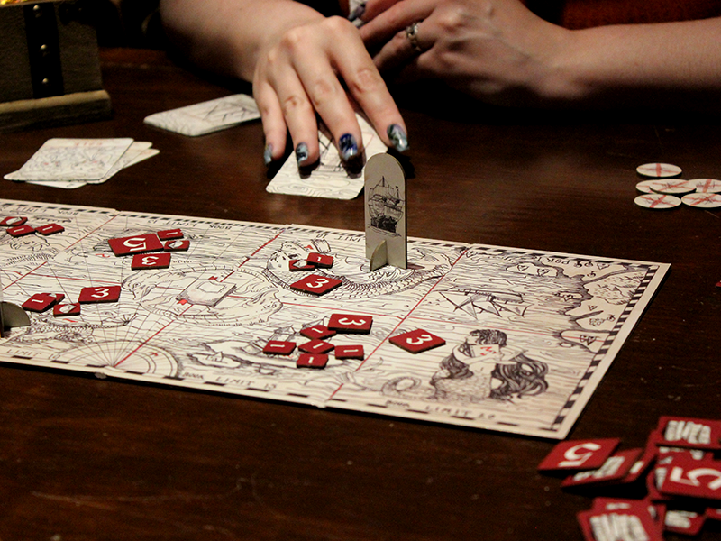 In Litera-Seas, players take command of their own pirate ships, moving between ports to drop books off at floating libraries so that the mermaids will keep the sea calm. Drop off enough books to force your opponent to sink their own libraries and sail off into the sunset!