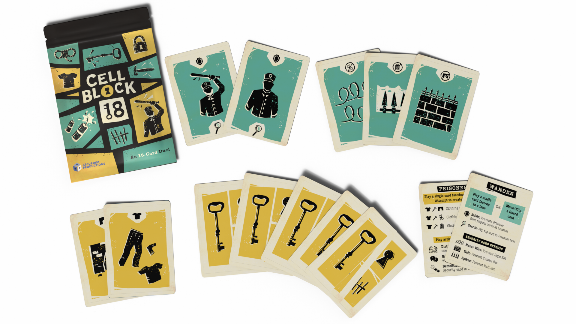 The warden plays cards face up, attempting to block the prisoner's escape. Guard cards can reveal the prisoner’s cards or block them from deploying cards to specific lanes. While defense cards block certain escape routes in specific lanes.