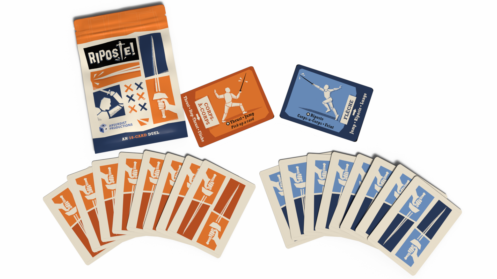 Riposte! is an 18-card strategy game. Both players have identical nine-card hands. Play starts with a random card from each player. Each card lists three other cards that can follow it. Players simultaneously choose and reveal their follow cards. Each card shows which other cards it scores against. If no one scores, both players choose another card for their next move, and the round continues. When someone scores a hit, the scoring card is removed from the game to track points. Players then pick up the rest of their cards and begin a new round. The first player to score their fourth point wins.