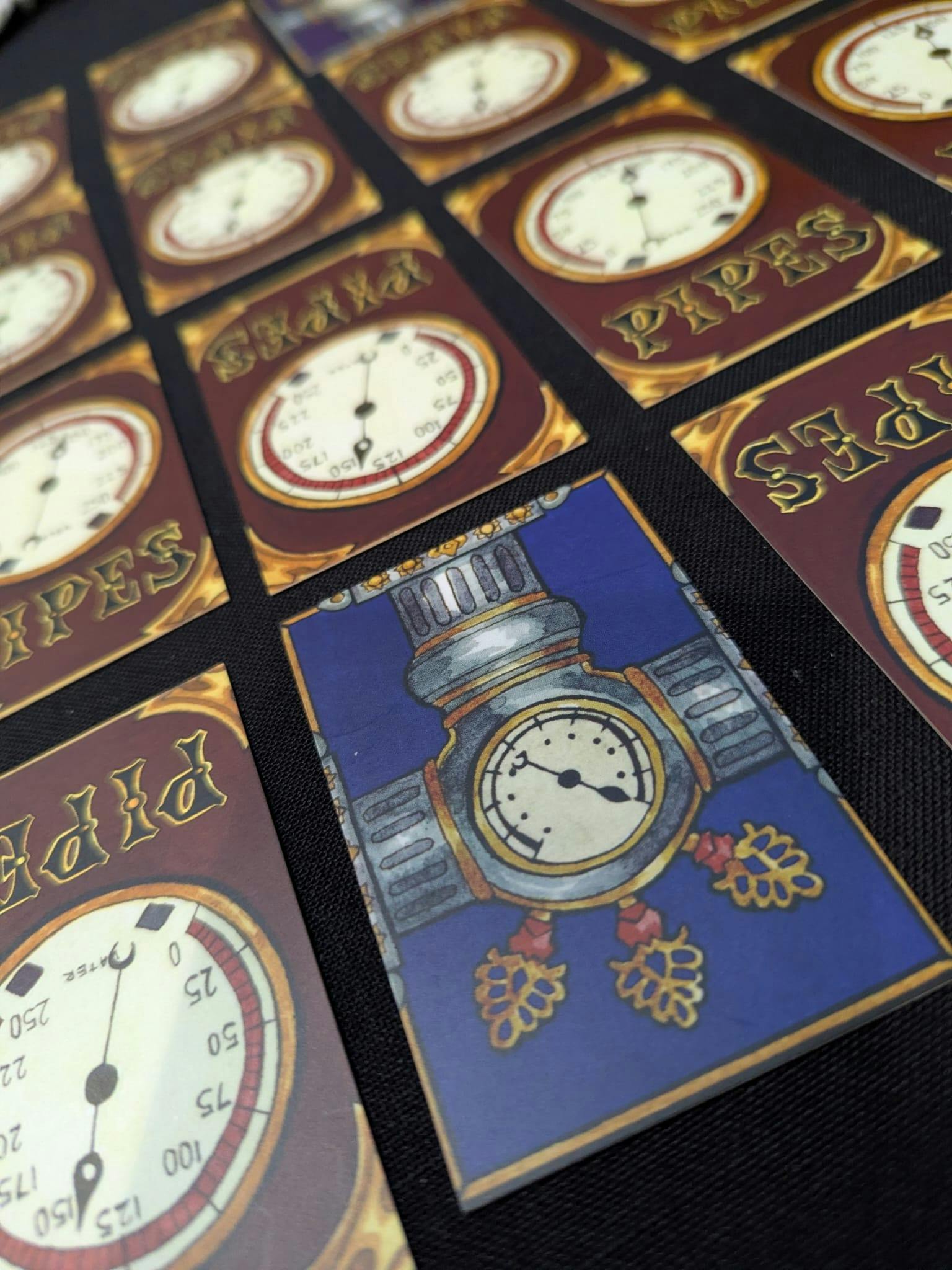 Pipes is a gateway strategy card game, a seemingly simple layout of 16 cards from a deck of 20, that creates the tension of racing pipework across the city. From an initial layout, players vie for control of the pipework to allow them to go from their standing supply valve past their opponents to prove who is best at steering the water and with it the future of the city and Empire.
