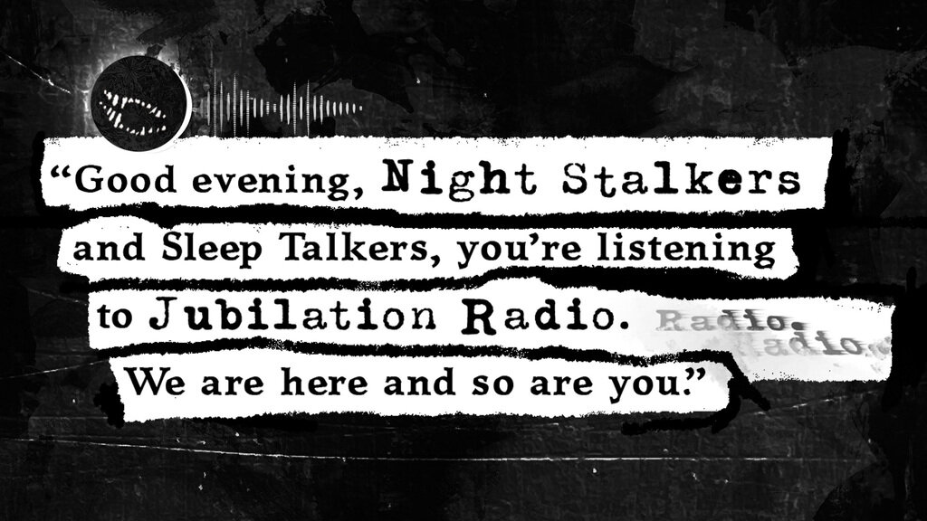“Good evening, Night Stalkers and Sleep Talkers, you’re listening to Jubilation Radio. We are here and so are you.”