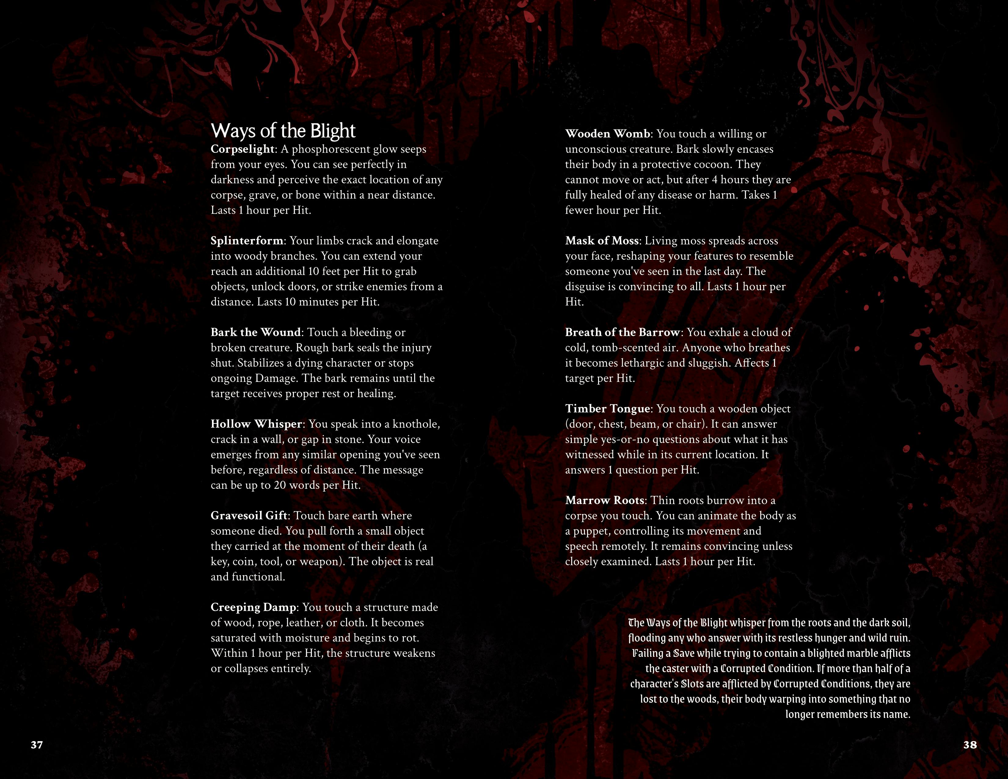 - 32 thematic spells broken down by themes (druids, light, blight).