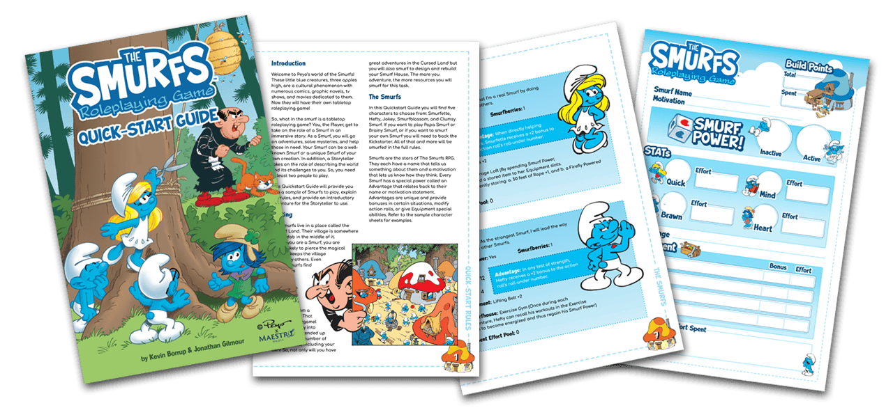 Are you ready for a smurftastic adventure!? Sign up for updates on our upcoming Kickstarter campaign for The Smurfs: Roleplaying Game and we'll send you the Quick-Start Guide digital PDF for FREE! It's 18 pages of Smurfy goodness and will provide you the core rules of the RPG and an introductory adventure called 'Papa Smurf Goes Missing'!