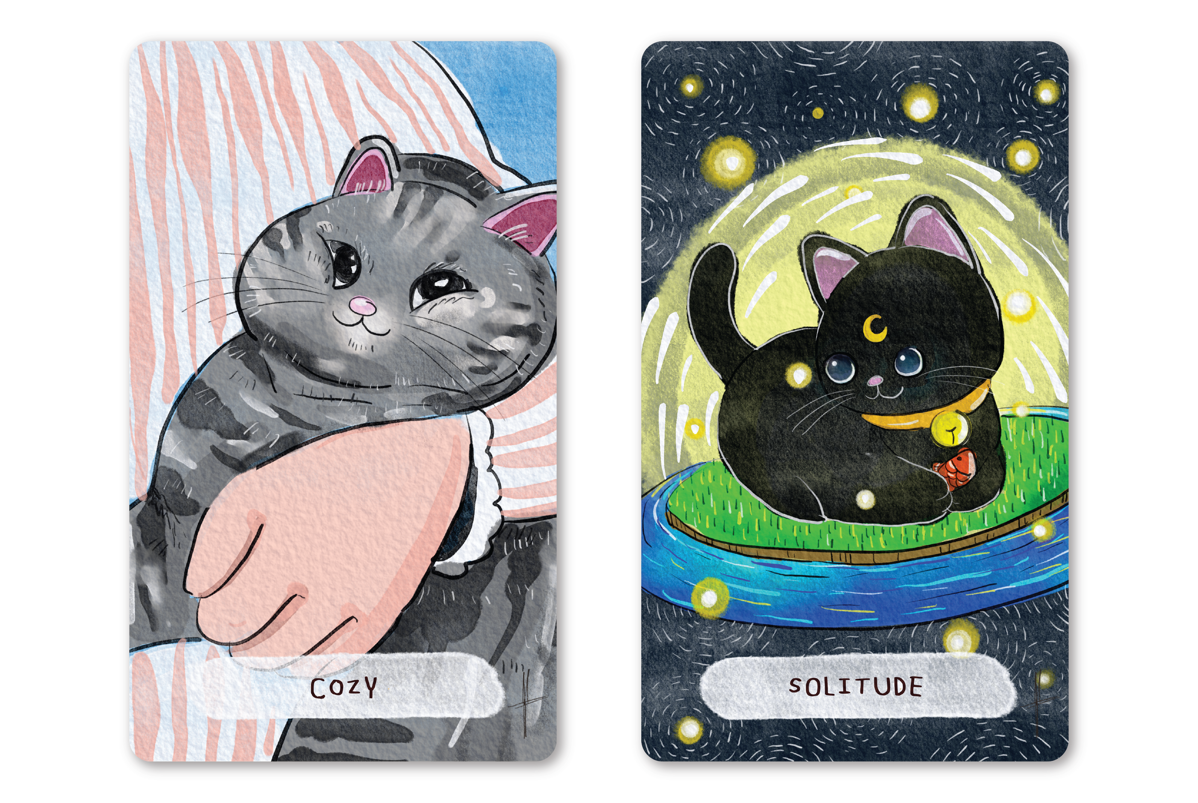 Within the enchanting "CHUBBY CAT" collection, the talented artist has crafted two unique cards that add a touch of magic and depth to the journey. These extraordinary cards, "Cozy" and "Solitude," each bring their unique essence to the collection.