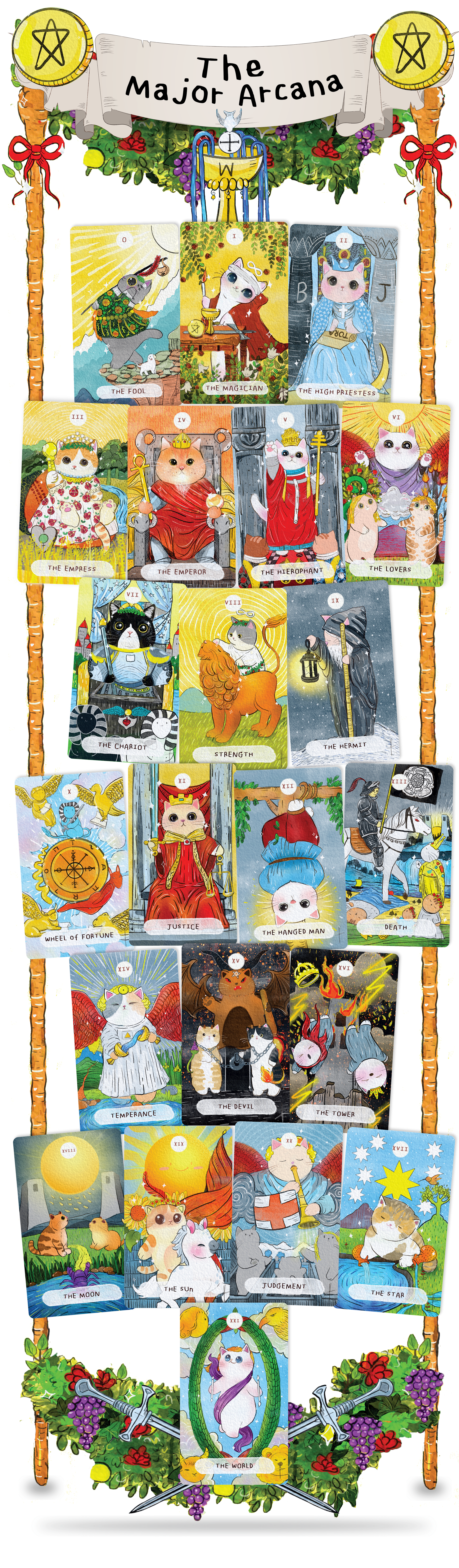 As each card graces the tableau, magnificence reigns supreme. In regal harmony with THE CHUBBY CAT, the essence of every card blooms, painting a portrait of profound significance. Each MAJOR card stands like a masterpiece on its own, while the character weaves in perfect unison with THE CHUBBY CAT. Here, the meaning of every card is a vivid stroke on the canvas of divination, creating a picturesque revelation that stirs the soul.
