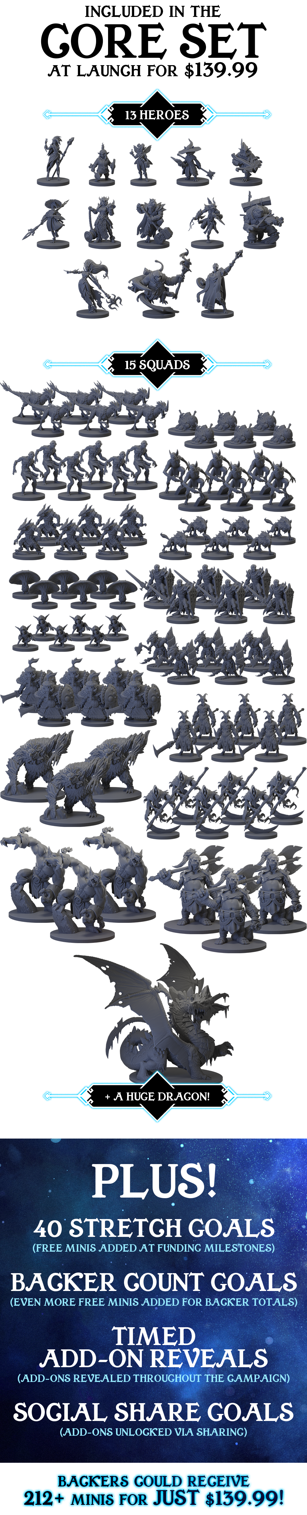 Should enough brave souls partake in the Forgemaster's offerings, 40 Stretch Goals have the potential to add up to 111 more minis to your pledge for a possible total of 212 miniatures—at no additional cost!