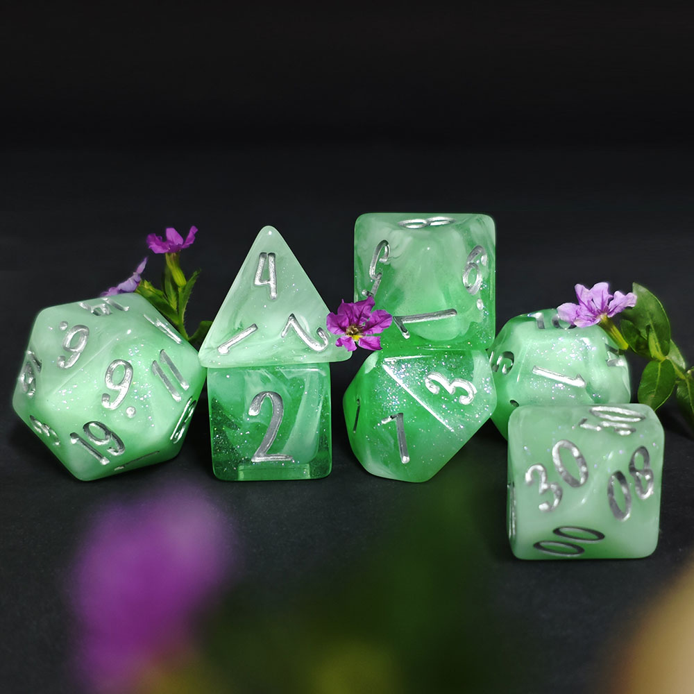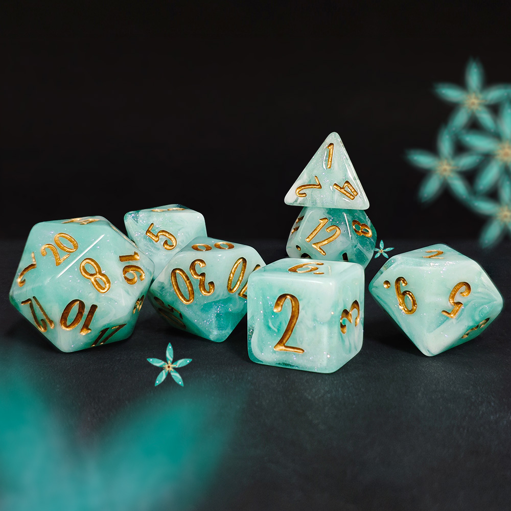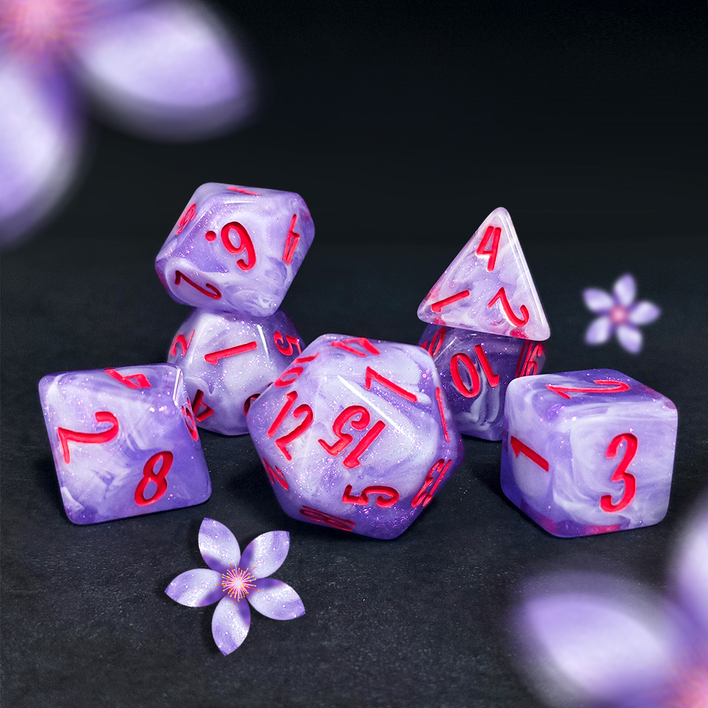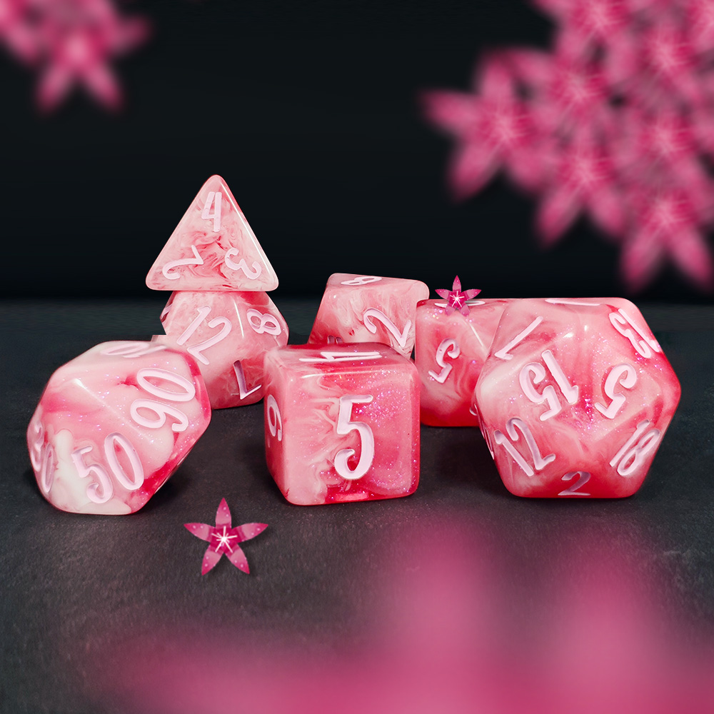 Step into the druid’s grove — Blossom & Bloom: 10 botanical 7-piece resin dice sets plus a 25mm floral D20. Bright, affordable, and crafted to bring springtime color to every roll.