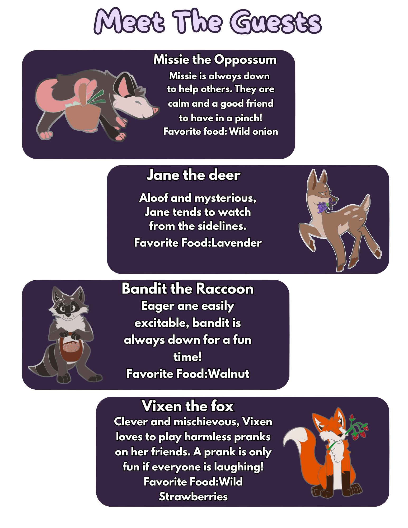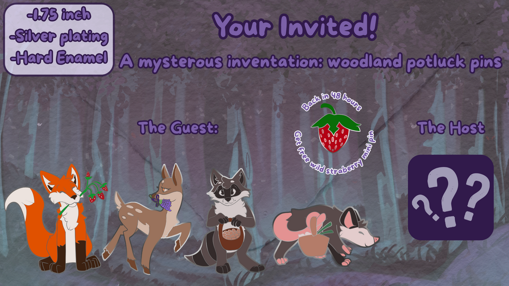 Four animals of the woods received a Strange envelope telling them to meet at a certain time and place with food for a surprise potluck. Backer kit campaign for enamel pins, starts on April 23rd!