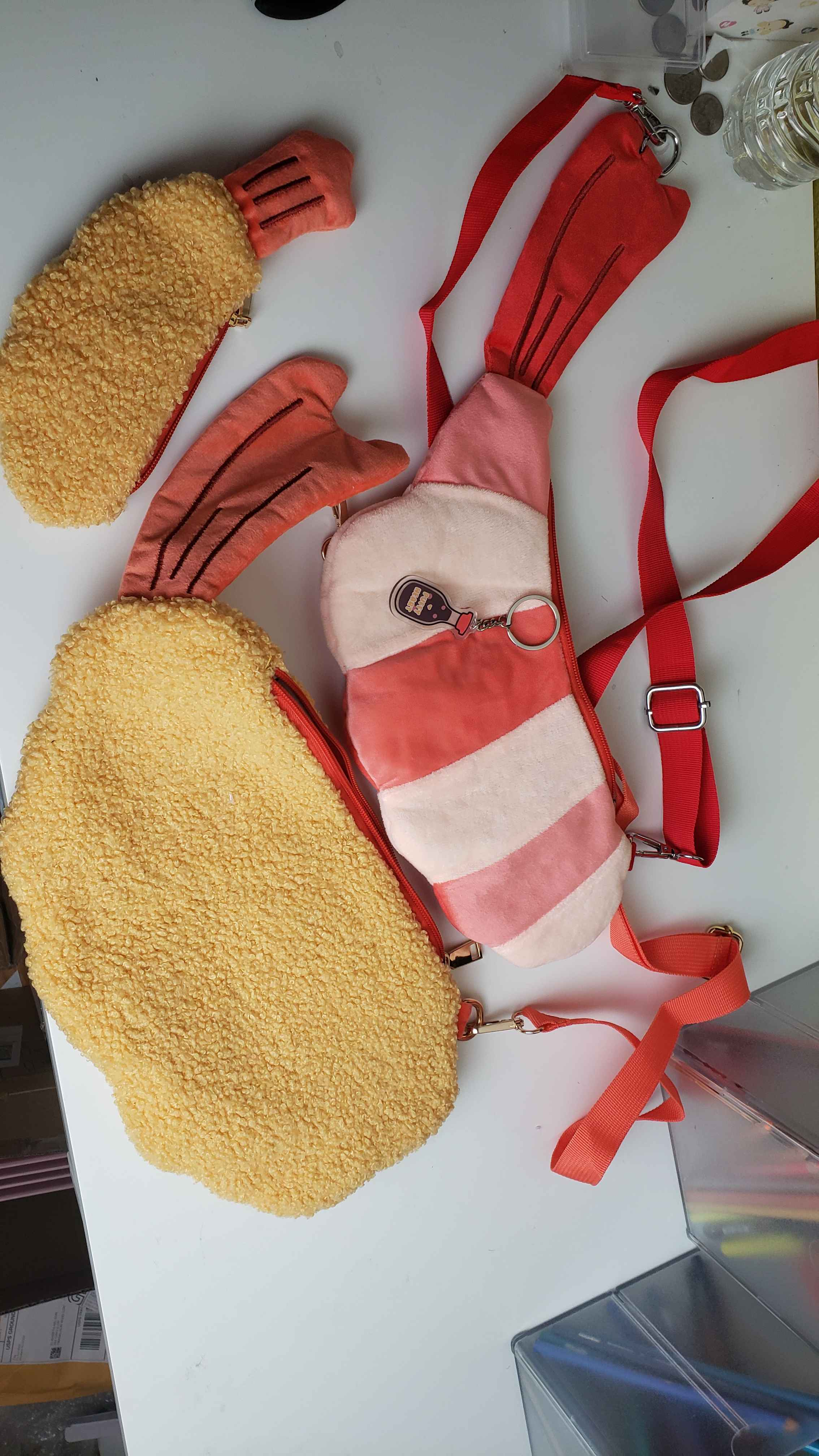 Both bags feature a long, adjustable matching nylon strap, metal hardware, matching zippers, a custom rice-and-seaweed inner lining (hand drawn by me) and THE BEST PART: The tail has a slip-pocket feature that can fit SO MANY GOODIES INSIDE