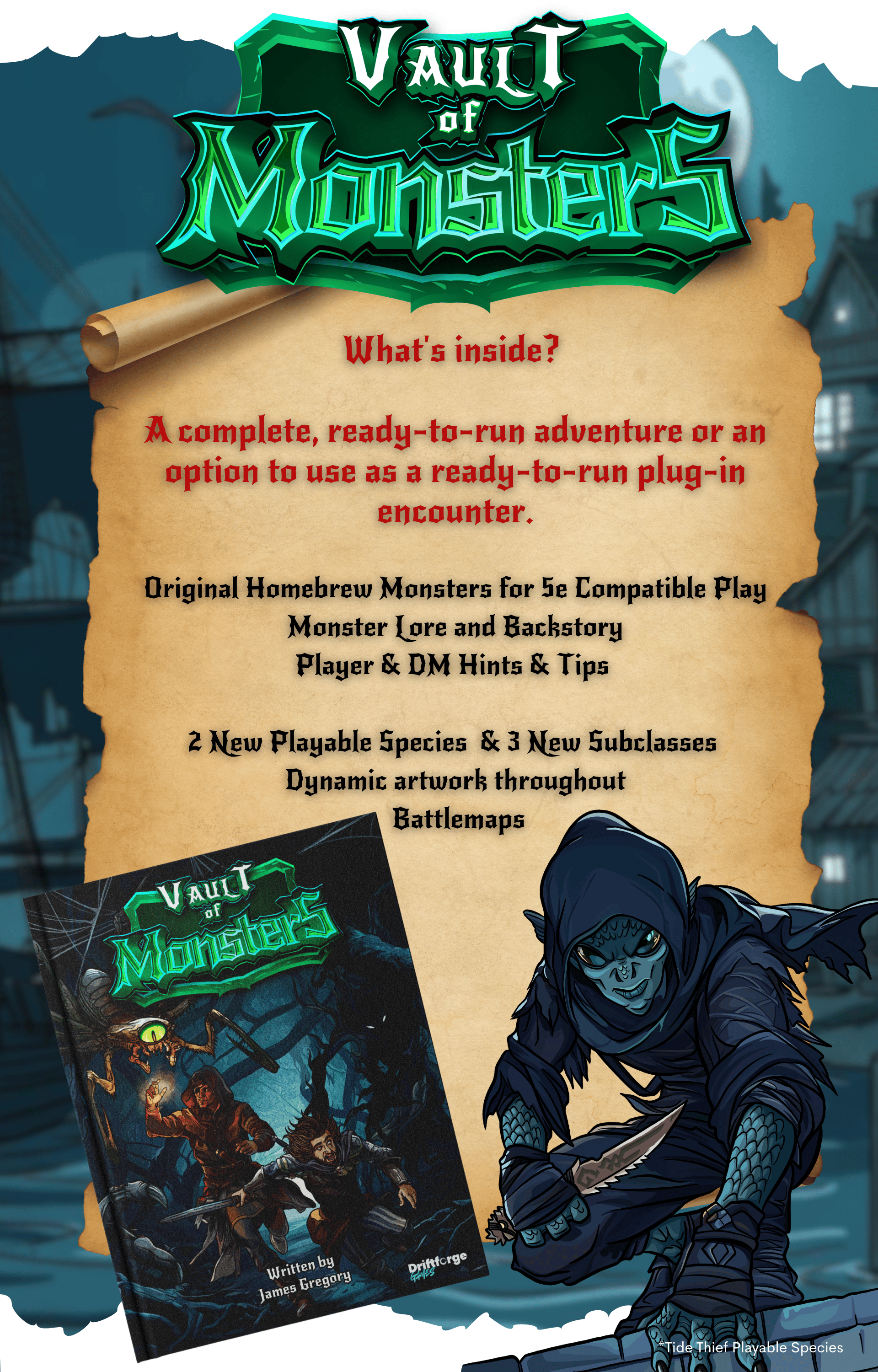 The Vault of Monsters is a chunky paperback, a little over 100 pages, packed with original creatures and drop-in encounters. Built for 5e compatibility, written for busy GMs, it's the kind of book you'll keep within arm's reach. Clear stats, usable lore, tidy tactics, plus selected battlemaps!