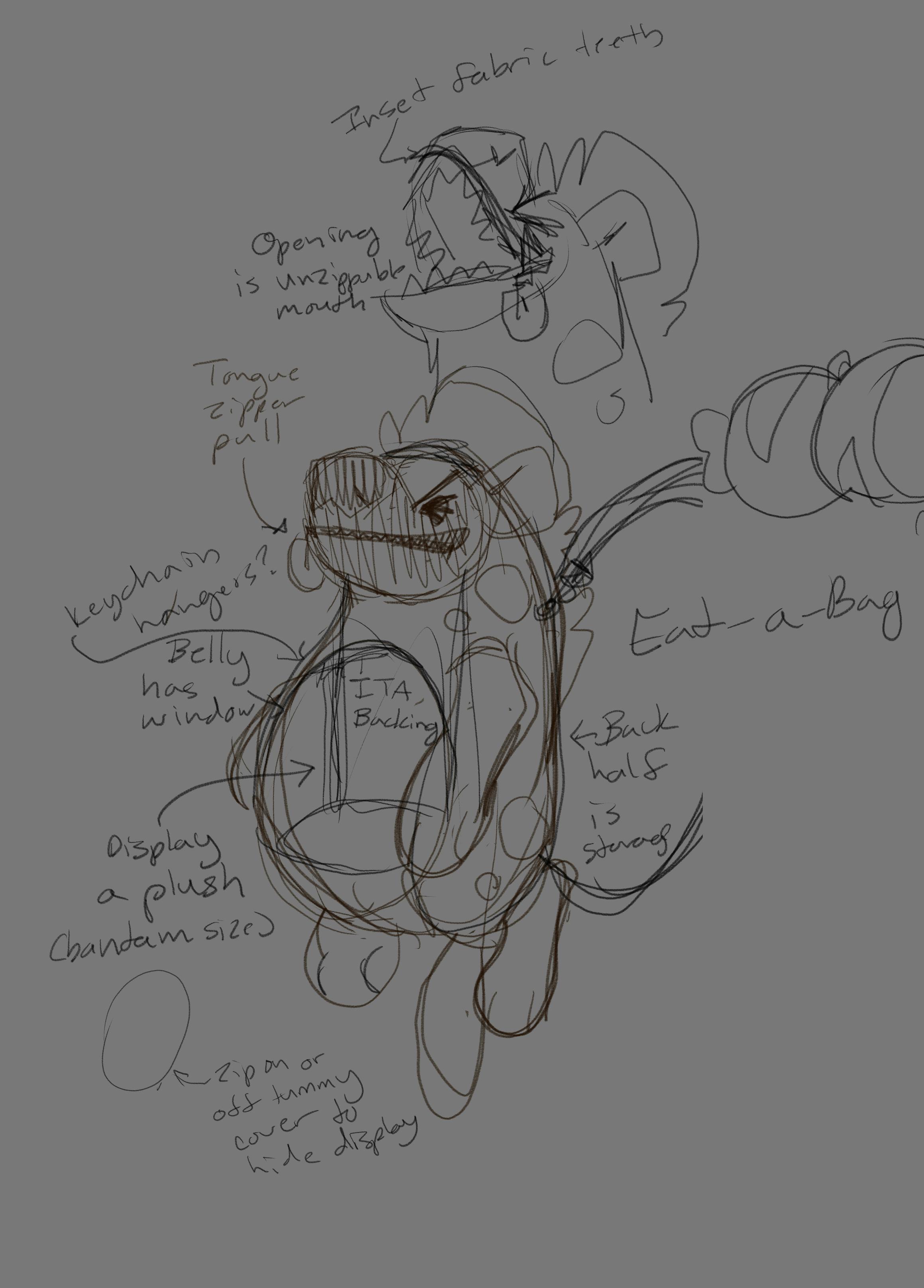 Carrion Baggage: Eat-A Bags are a concept combination of our Gnawesome Predator pins and our Carrion Baggage meat bags! These window-belly backpacks follow the theme of both peckish predators and practical plush in the form of animals with a visible gut. The bag is accessed through the mouth of the animal, which unzips to reveal a mouth full of toony teeth!