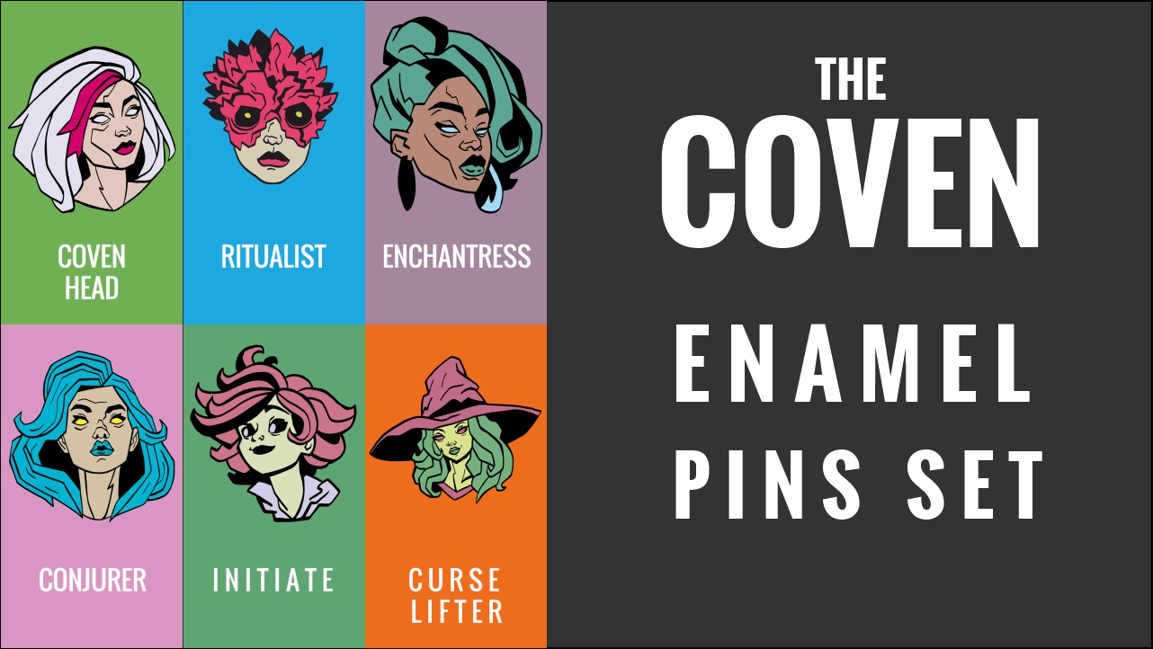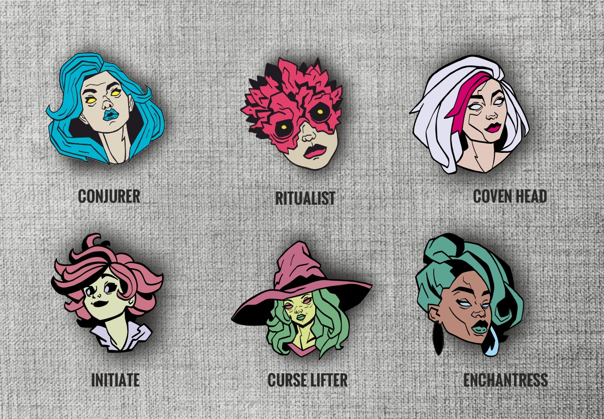 Inspired by horror movies ? Featuring My favorite musicians ? Literature, comics or maybe computer games ? As I was fresh from watching "The Owl House" (a great animated series that I highly recommend to everyone) at the time, I thought about the witch theme. After discussions with family and friends, the idea for THE COVEN was formed. Each pin depicts a witch and her role in THE COVEN. I had a lot of fun drawing these characters, and I'm glad they can finally see the light of day.